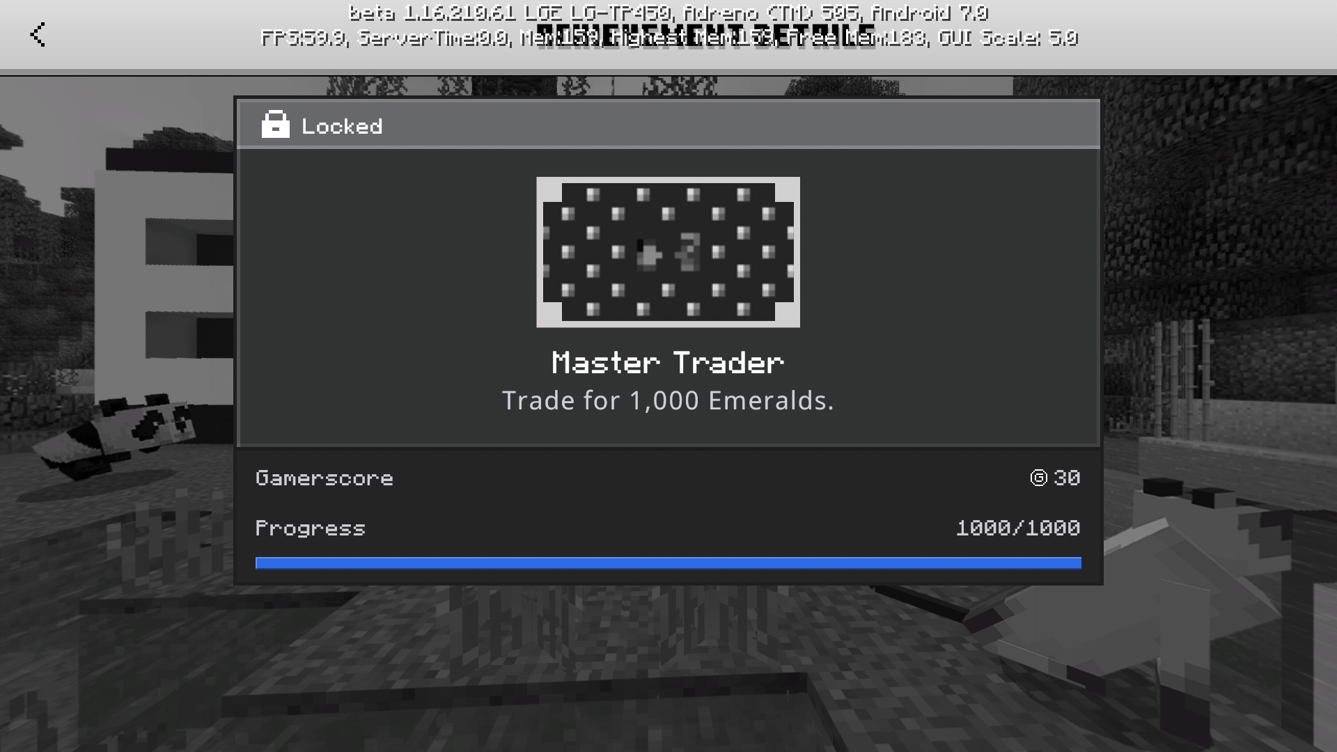 I didn't wait long, I did what "usually works" to get an achievement to log: I shut down and reloaded minecraft. In every other case this gets the system to recheck whatever stores achievement data. Well, it did "update" as you can see from the screenshot I took. It DID list the 1000th emerald in the task progress bar but it still listed the task as incomplete with 1000/1000 emeralds. I restarted minecraft again, still incomplete at 1000/1000. So I logged on here, filed the bug report, then decided what the heck and sold 1 more stack of books to my librarian. The achievement instantly completed and I came back here to comment. A mod then helpfully edited my description to include the comment in the main body.