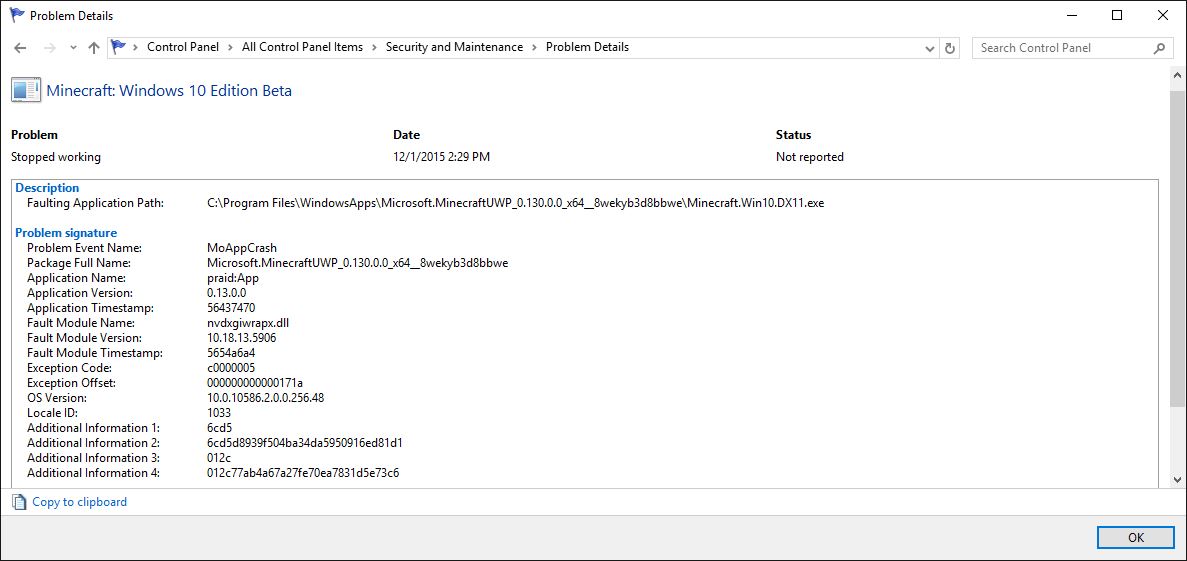 Starting with version 0.13.0, when I launch Minecraft: Windows 10 Edition on my laptop, Minecraft: Windows 10 Edition crashes immediately on the Mojang loading screen. I have an NVidia GeForce GT 525M (GF108) (Dell Inspiron 17R (N7110) with GeForce Driver 359.06 (crash also happens with GeForce Driver 353.00) and also have GPU: Intel HD Graphics 3000 (2nd Generation Intel Core i5-2410M), driver version: 9.17.10.4229. Crash only happens when the NVidia GeForce GT 525M (GF108) GPU is enabled. I can workaround the issue by disabling the NVidia GeForce GT 525M (GF108), letting Minecraft: Windows 10 Edition load to the Main Menu, then re-enable the NVidia GeForce GT 525M (GF108) GPU. This is frustrating because I have to use the workaround when I want to play Minecraft: Windows 10 Edition. Please fix this issue. This bug also exists in version 0.13.1.