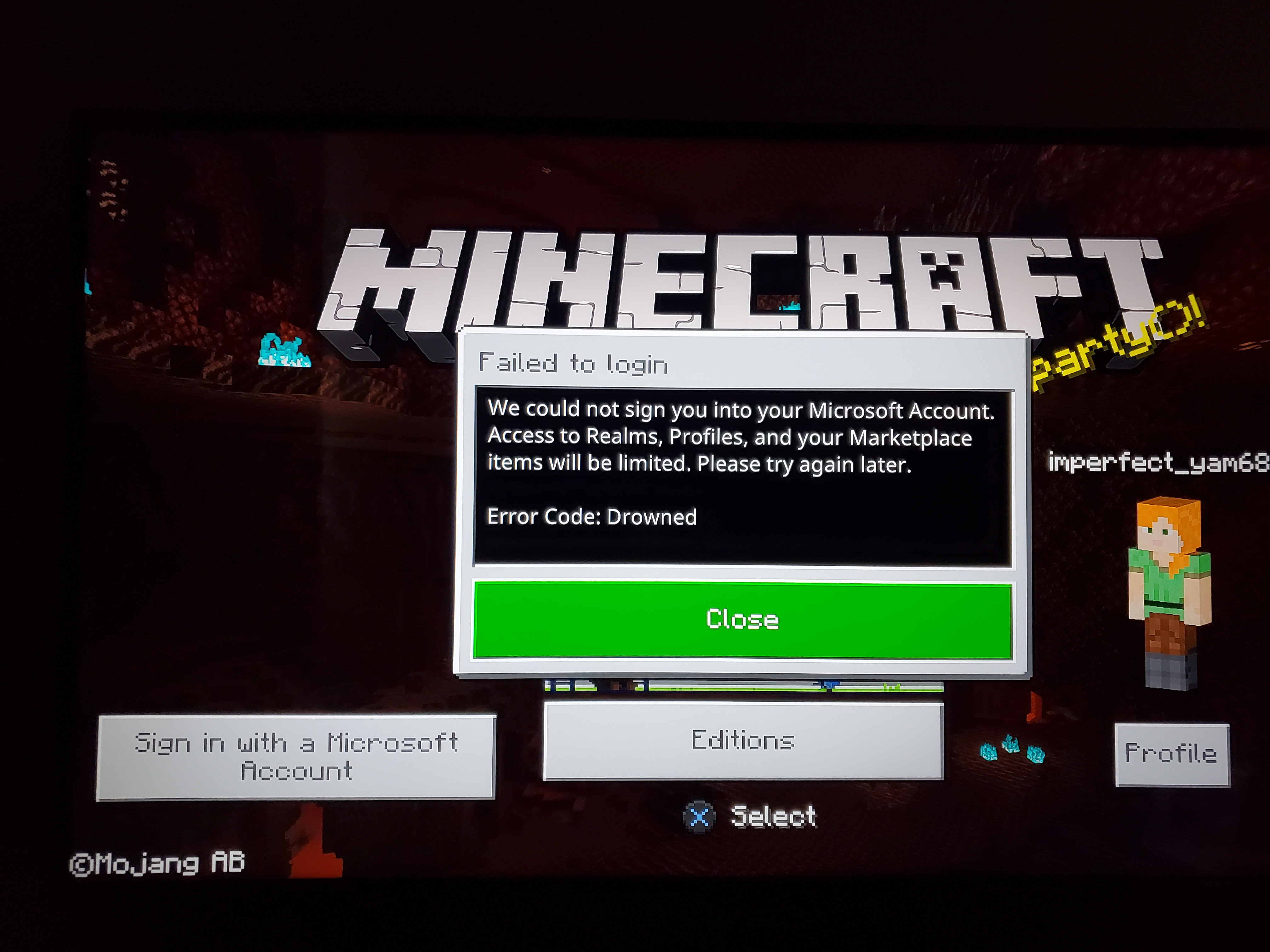 This Problem has been happening for a couple days now and what happens is I go out to sign into my Microsoft account when I want to play Minecraft on my PS4 into will not let me sign in it says failed to log in we could not sign you in your Microsoft account access rounds profiles in your marketplace items will be limited please try again later error code drowned