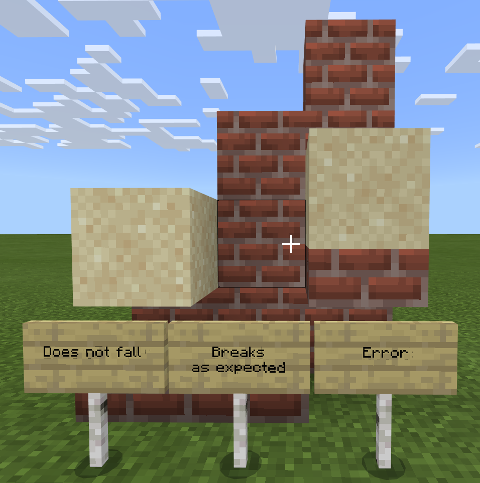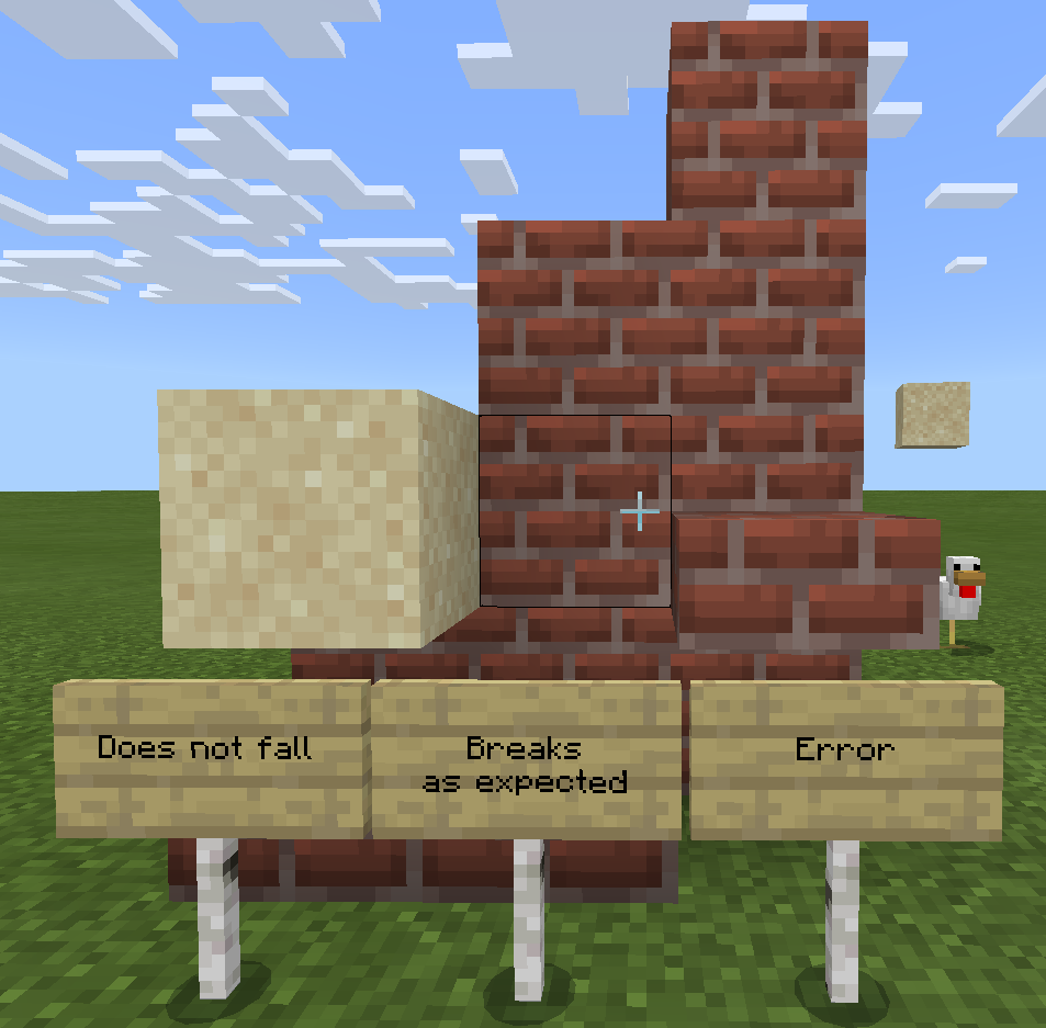Original report: There are actually four blocks (two sand blocks, two gravel blocks) on the picture. I did try to mine them (using shovel or bare hands) and it is damaging the tool but not breaking the block. I did save the game and reloaded and those were still there (originally only with sand, I tested gravel as well when I found this). They break eventually, sometimes after few seconds, sometimes after quite a lot of time.