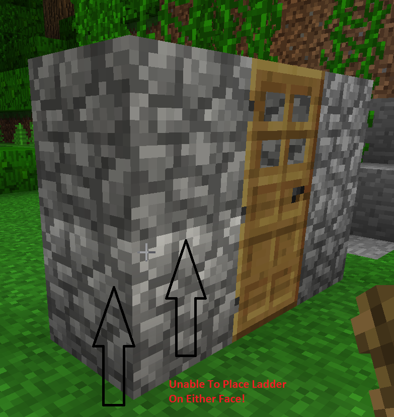 Unable to place ladder block onto a normal block(mud,cobblestone,etc..) which is next to a door (on any plane) See Screenshots.