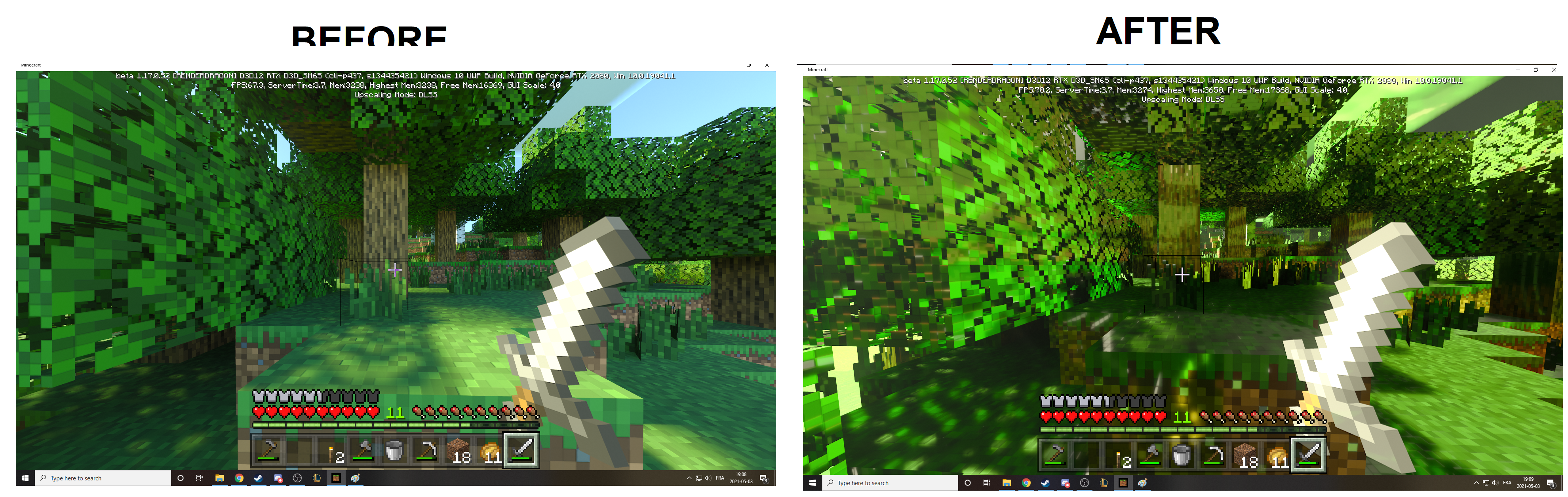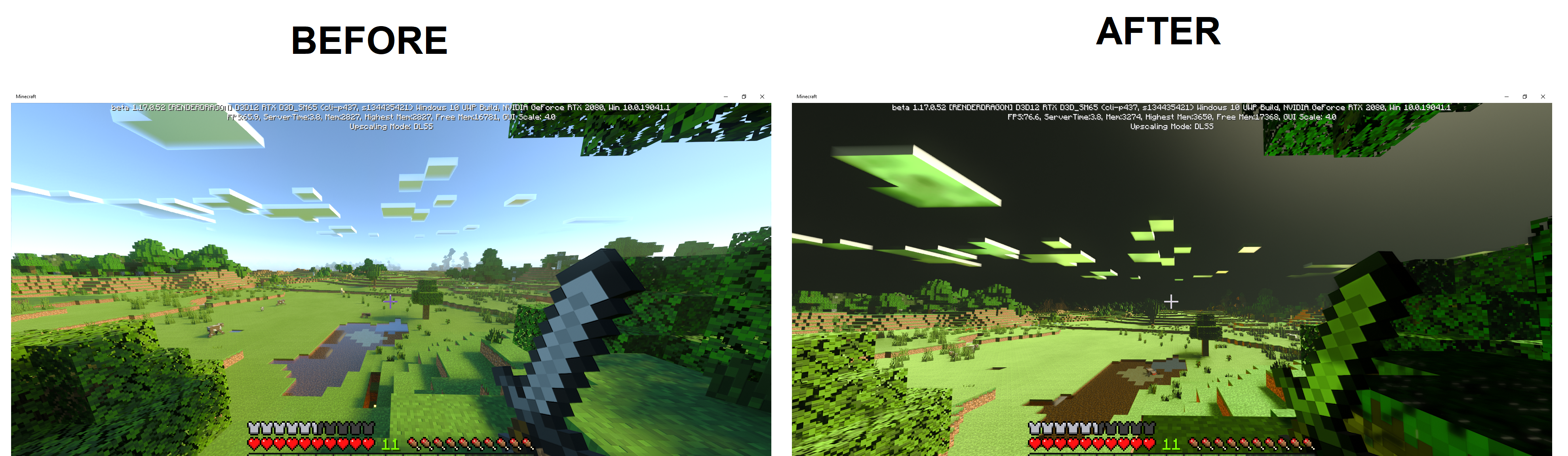 when launching any world with an approved RTX texture pack and approriate hardware, everythings runs fines up until the point you switch from fullscreen to windowed or vice versa while in-game by pressing F11. Switching it back don't resolve the problem, the only way to go back to normal is to quit to the main menu and enter the world again.