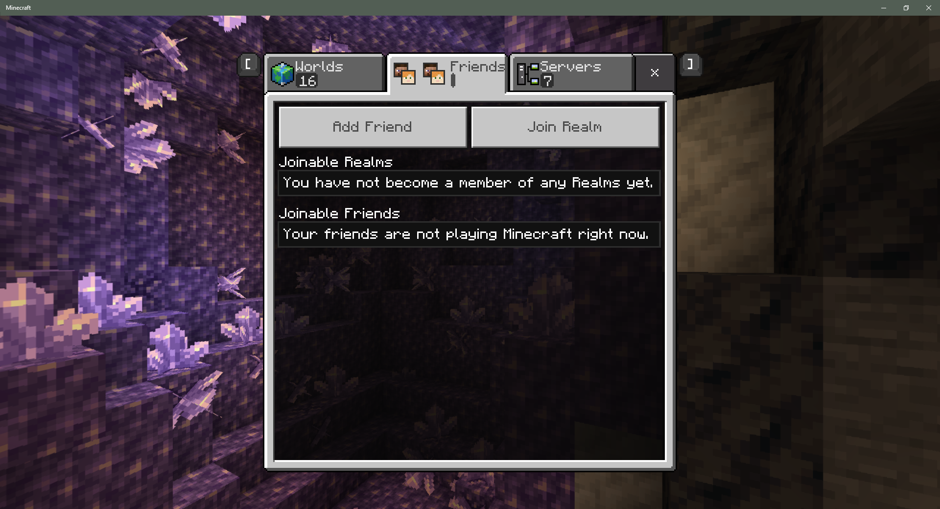 The world selection screen (accessed from the main menu Play button) has 3 tabs for Worlds, Friends, and Servers. Each tab has an animated icon and a label.