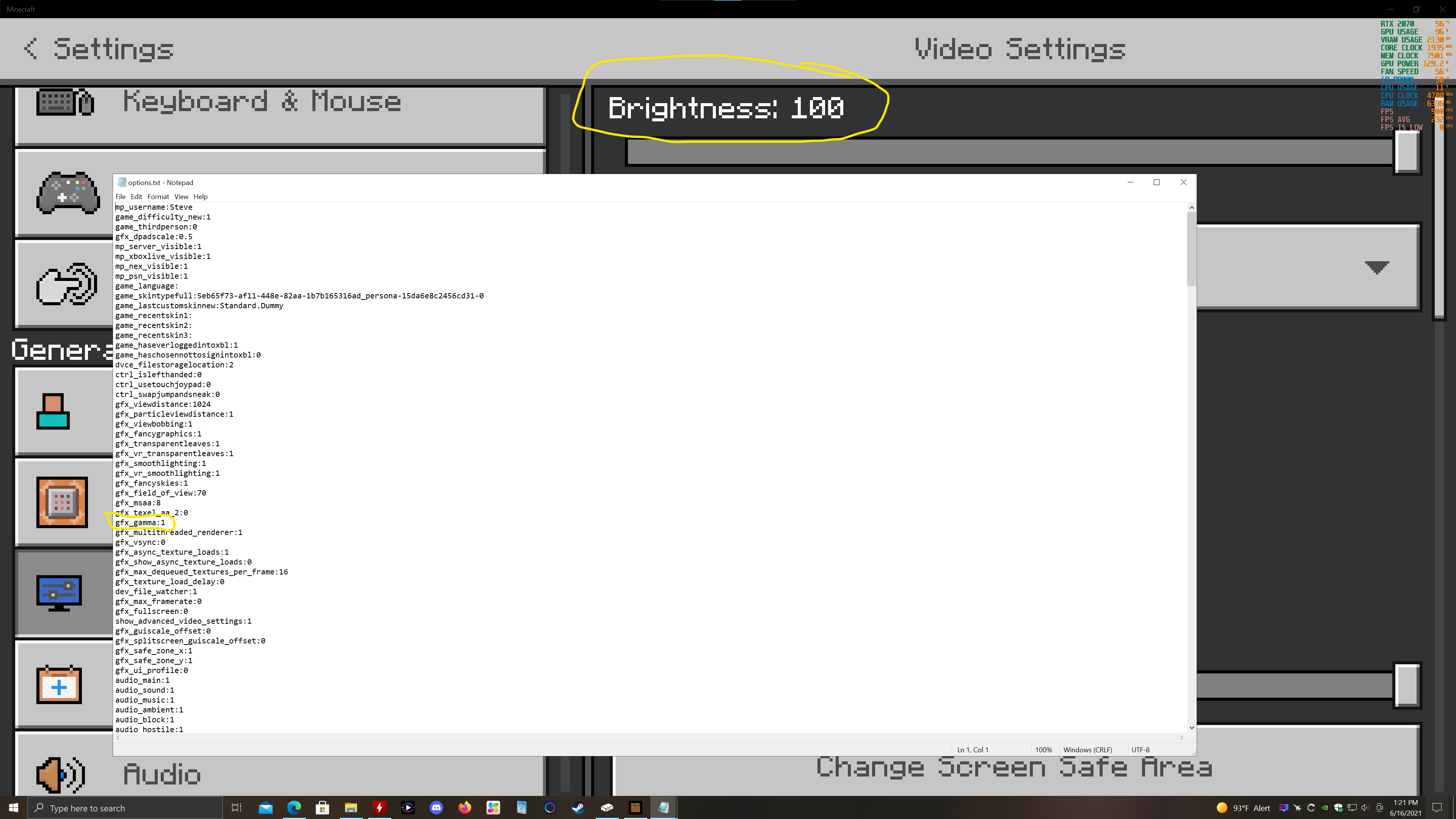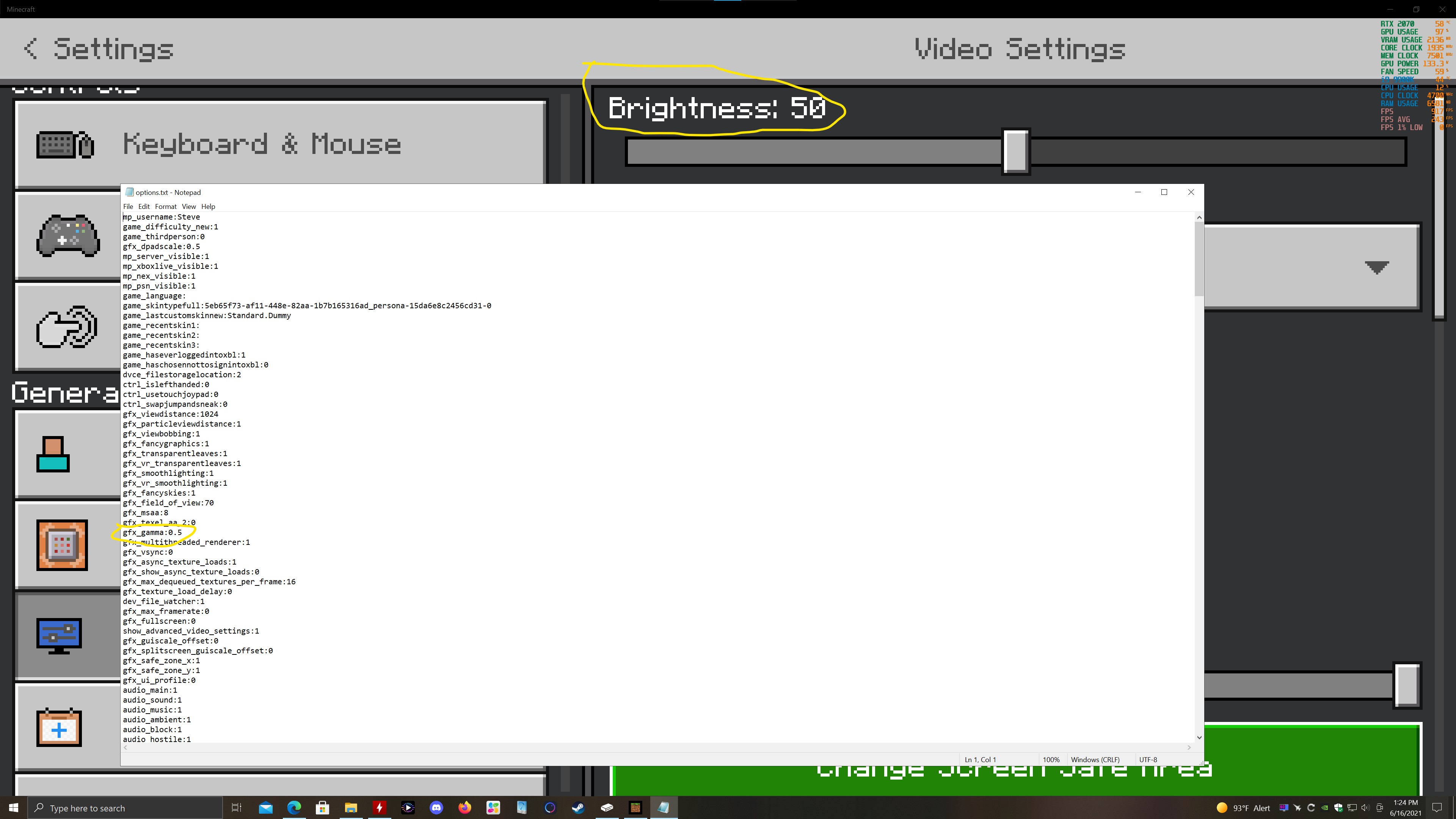 In the modifiable options.txt file for Minecraft, Bedrock Edition in Windows 10 I noticed a strange attachment. The Brightness slider controls the GFX_GAMMA setting in the options.txt file? They are two different settings in a monitor/HDTV and should be two different settings in game. Standard Gamma for a video or a game application is 1 while standard Brightness is around 50 out of 100.