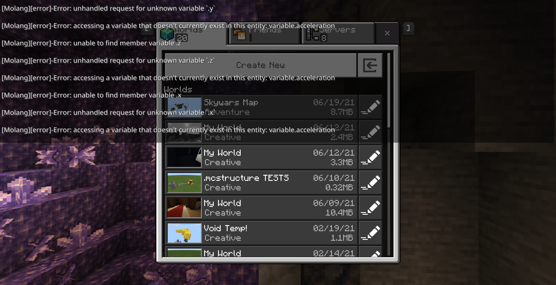Molang error saying things about acceleration, color, and xyz axes. I have been working on a world for weeks and I recently updated it to 1.17. It was working fine until I tried to get the world onto a different computer and now it won't stop spamming these errors. I found out that it also has to do with particle commands. They all still work, but when I destroy the particle commands, the errors stop. I was able to get the errors to stop by disabling things in the creator settings, but this is going to be a public map download and I don't want people to download is without knowing how to stop it. The errors start when I open the world, but are still there when I close the world, and are still there until minecraft is closed and reopened.
