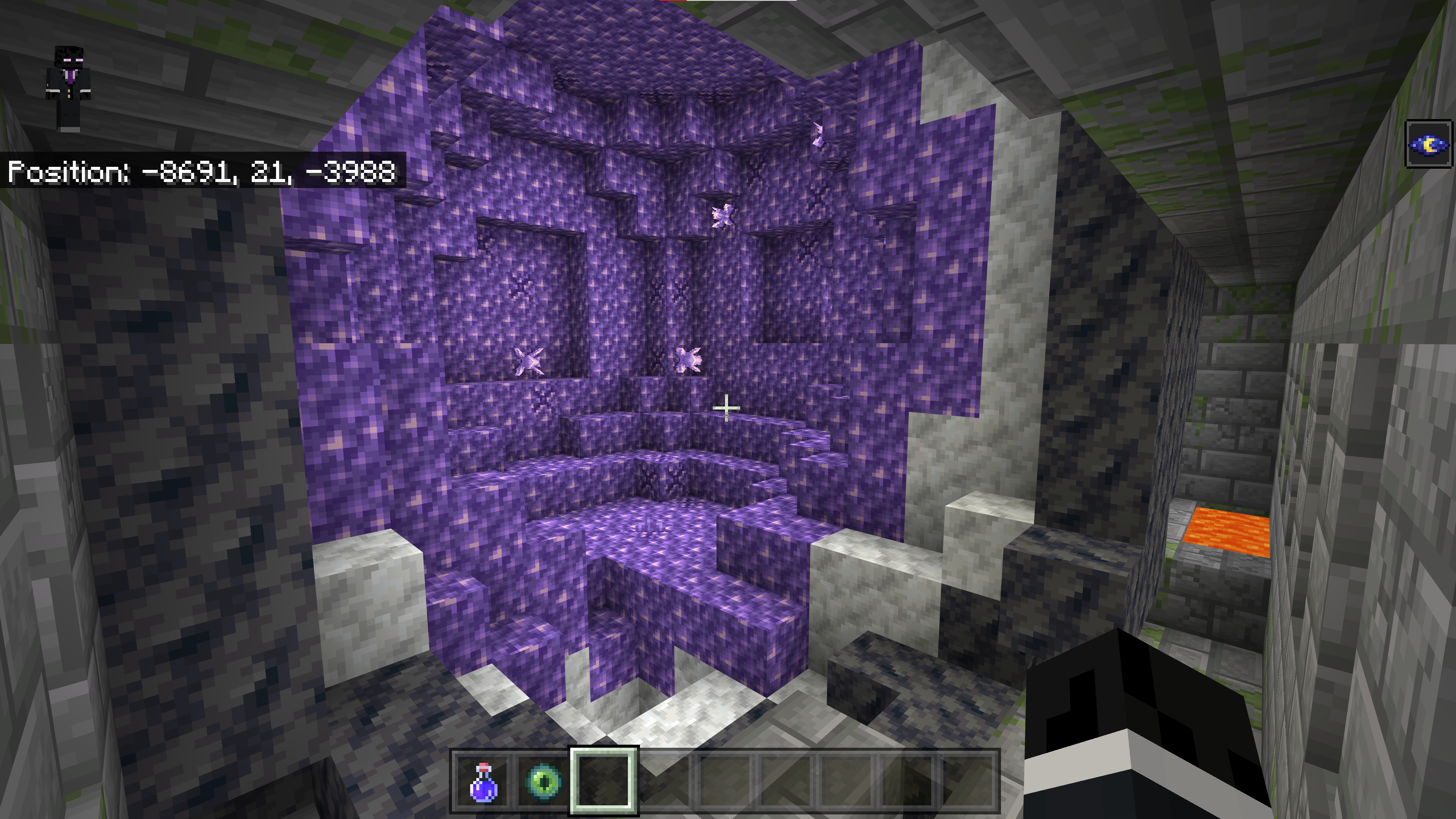 In the stronghold where the end portal frames are supposed to spawn, there is instead a Amethyst Geode in its place at the coords provided.