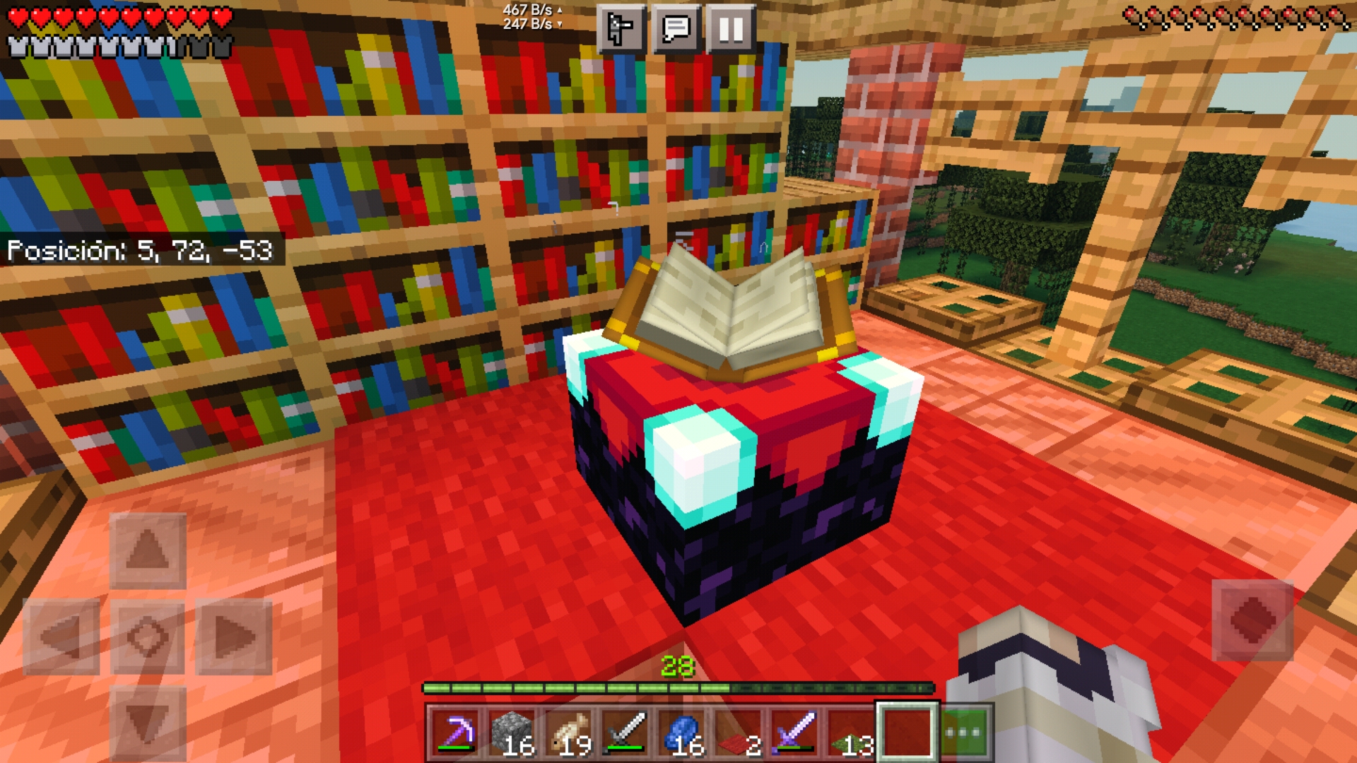 When trying to decorate around my enchantment station, I found that the moss rugs that I placed on the floor were blocking the effect of the bookcases adjacent to the moss rugs. This does not happen with wool rugs, as they do not interfere with the effect of the bookcases on the enchantment table.