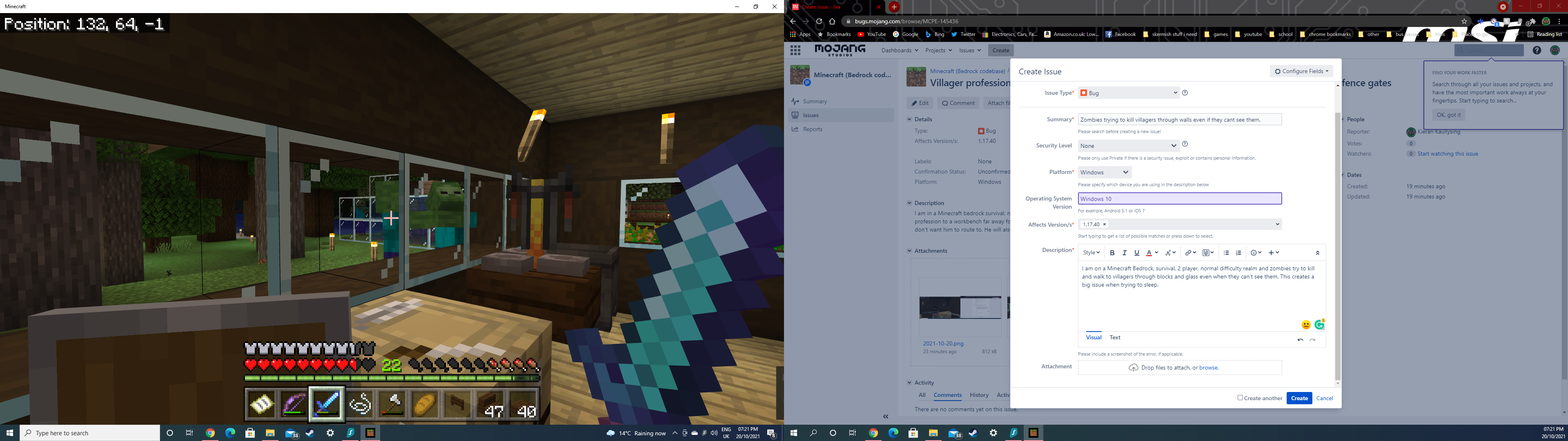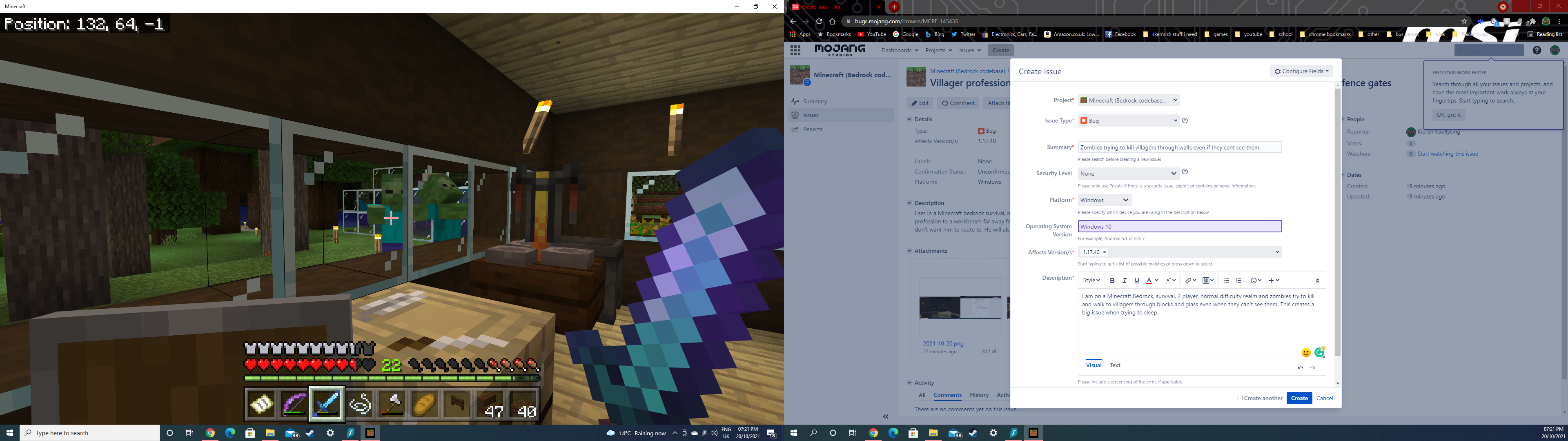 I am on a Minecraft Bedrock, survival, 2 player, normal difficulty realm and zombies try to kill and walk to villagers through blocks and glass even when they can't see them. This creates a big issue when trying to sleep.
