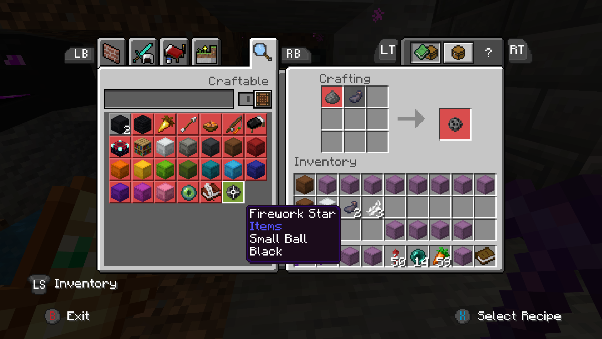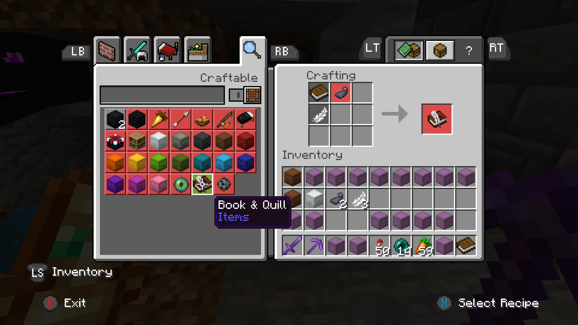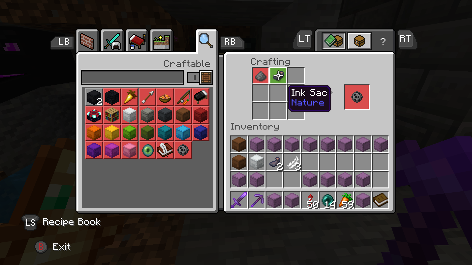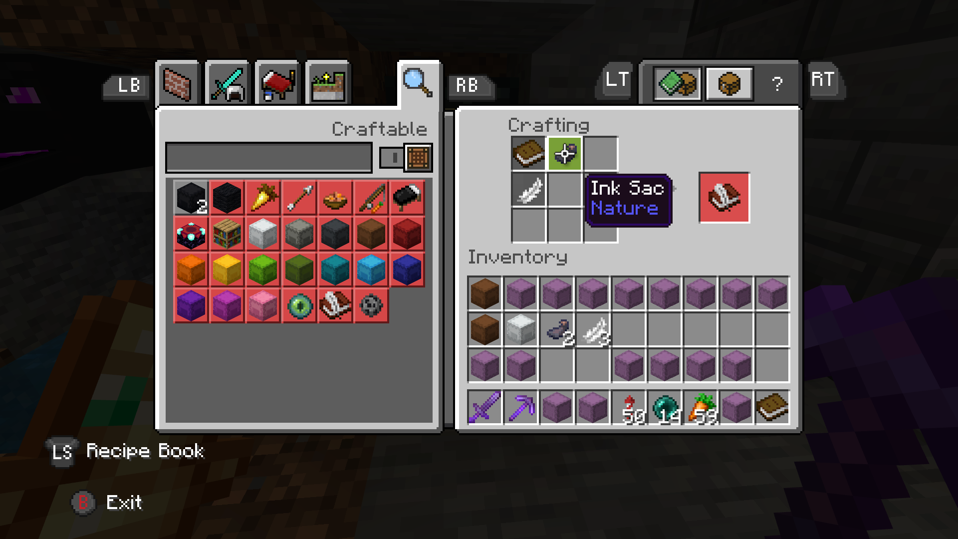 I cannot craft a book & quill or black dye even though I have all of the required ingredients. The ink sac is highlighted red in the recipe book for both, and when I put the items into the crafting bench manually the output remains empty as if the ink sac was missing. I can however, craft items like black carpet or black shulker boxes using the same ink sacs.