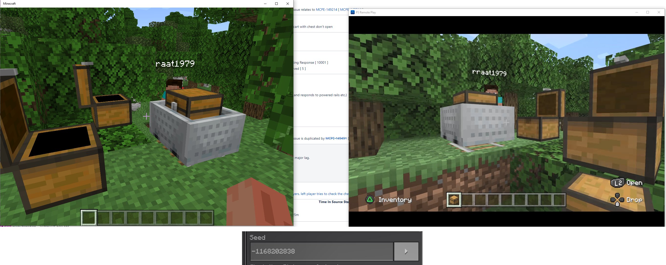 I came across abandon mineshaft and found a minecart with chest, tried to open it and didn’t open, then I tried to open my inventory and my inventory didn’t open, something I can’t really show in video, so I had to restart world and inventory opens but you can’t open the minecart with chest. It will keep repeating over and over again if you try and open minecart with chest.