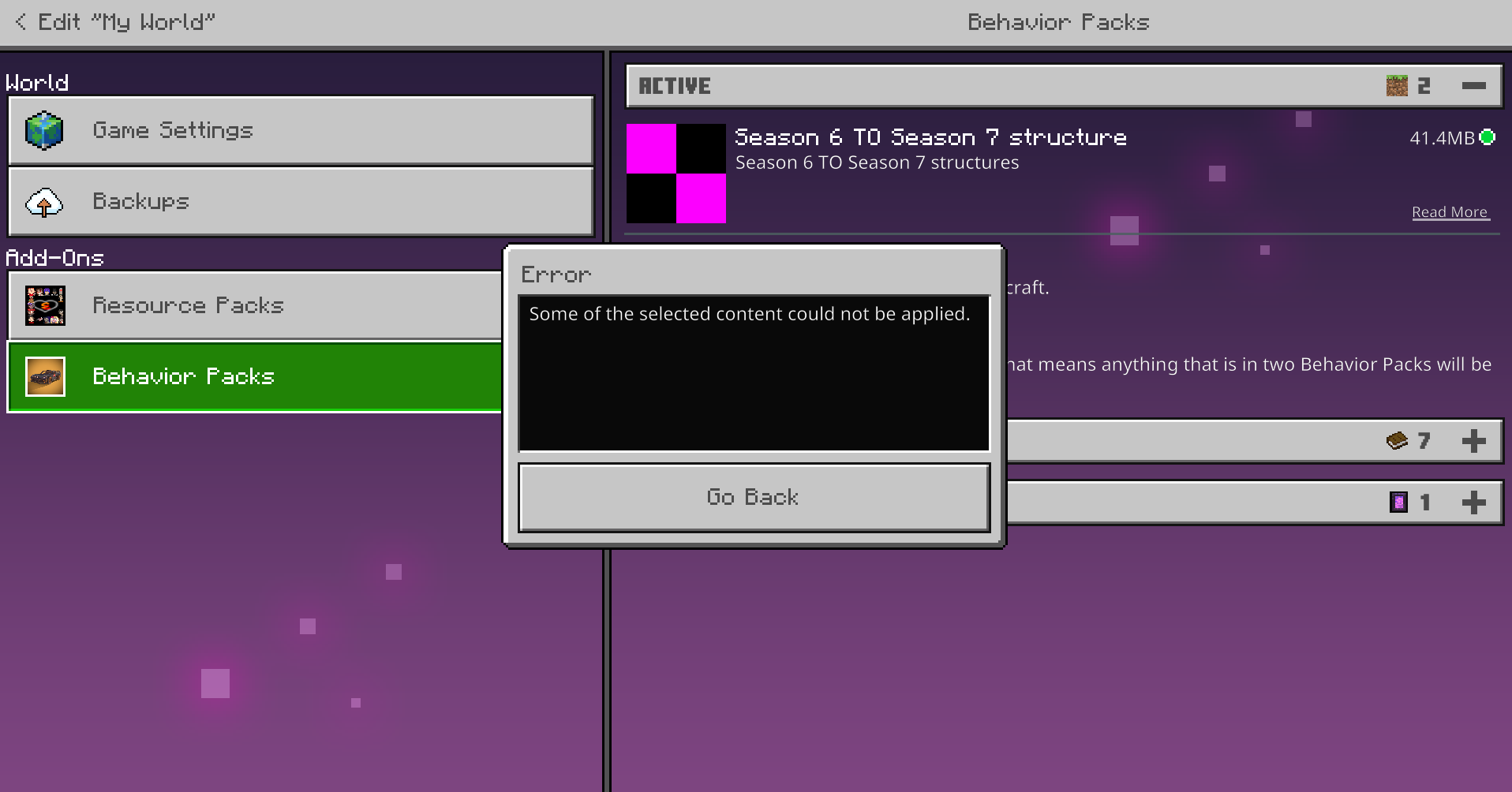 I've tried multiple different addons, including behavior packs & resource packs, but i always get the same outcome (view pictures).