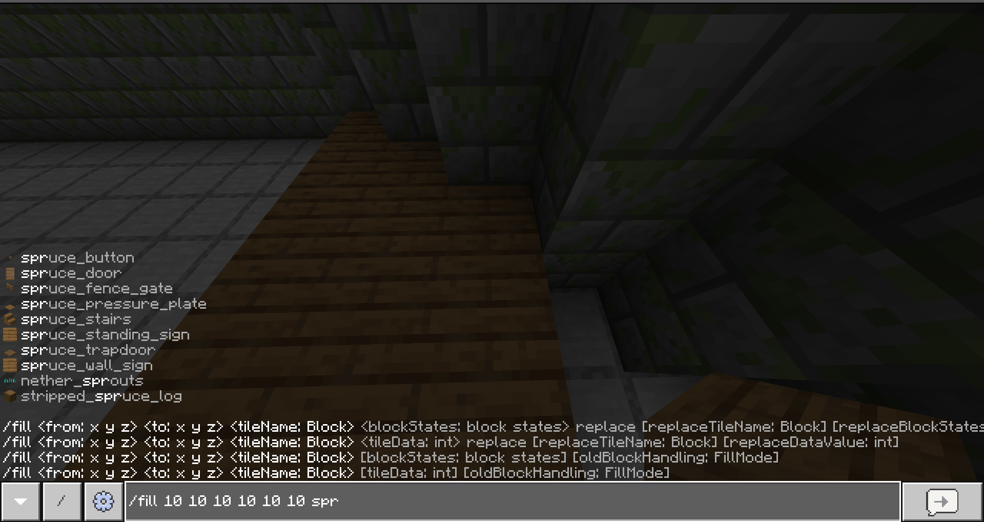 Spruce wood planks and mossy stone bricks for some reason aren't there in the /fill command anymore and it has been happening since 1.17.40 but spruce wood planks were still there