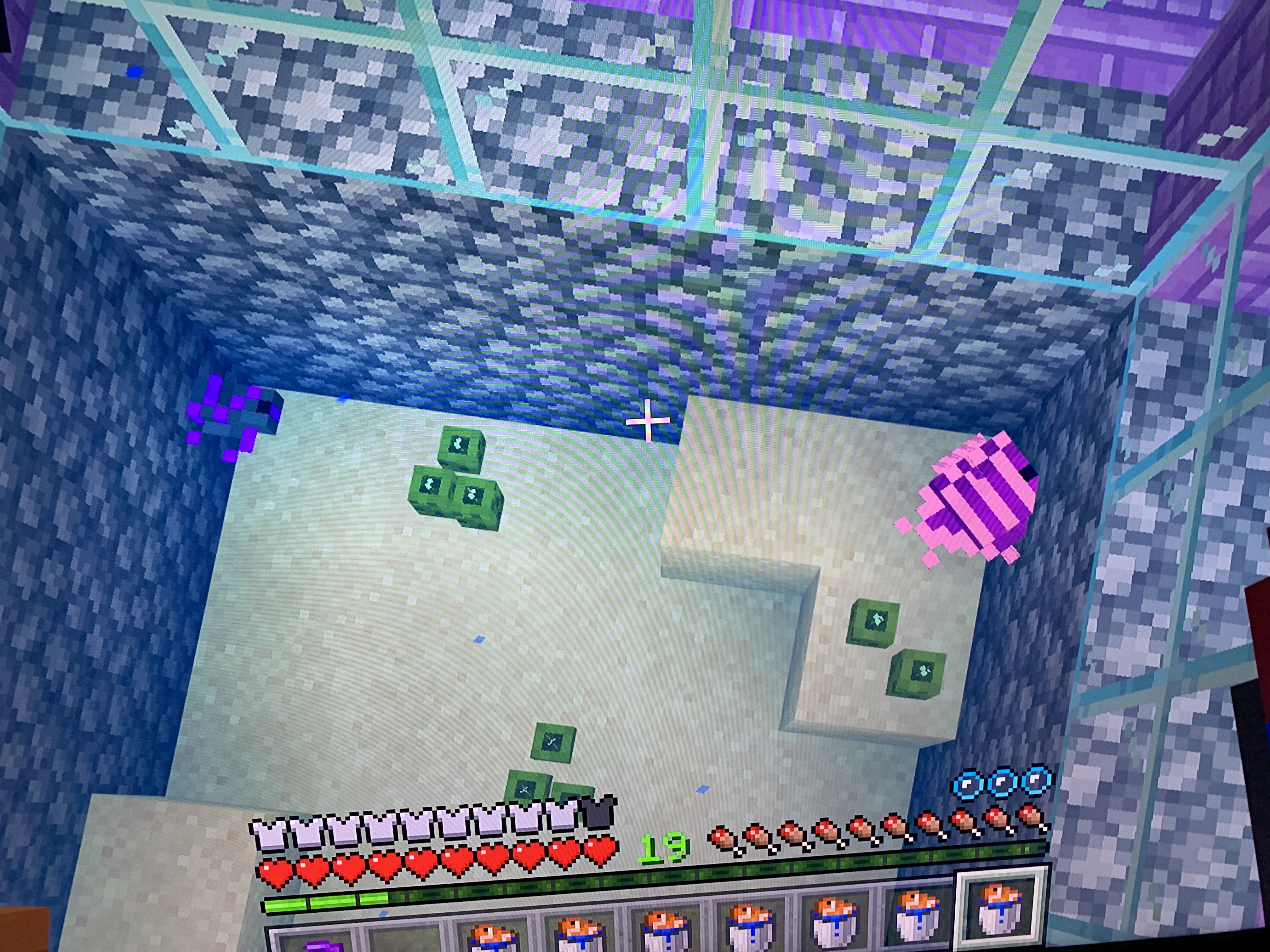 When this chunk was loaded the fish in my aquarium are frozen in this state of flopping. I think this might be since the game loaded the entities before the terrain (water). They are still alive and interactable but they display different.