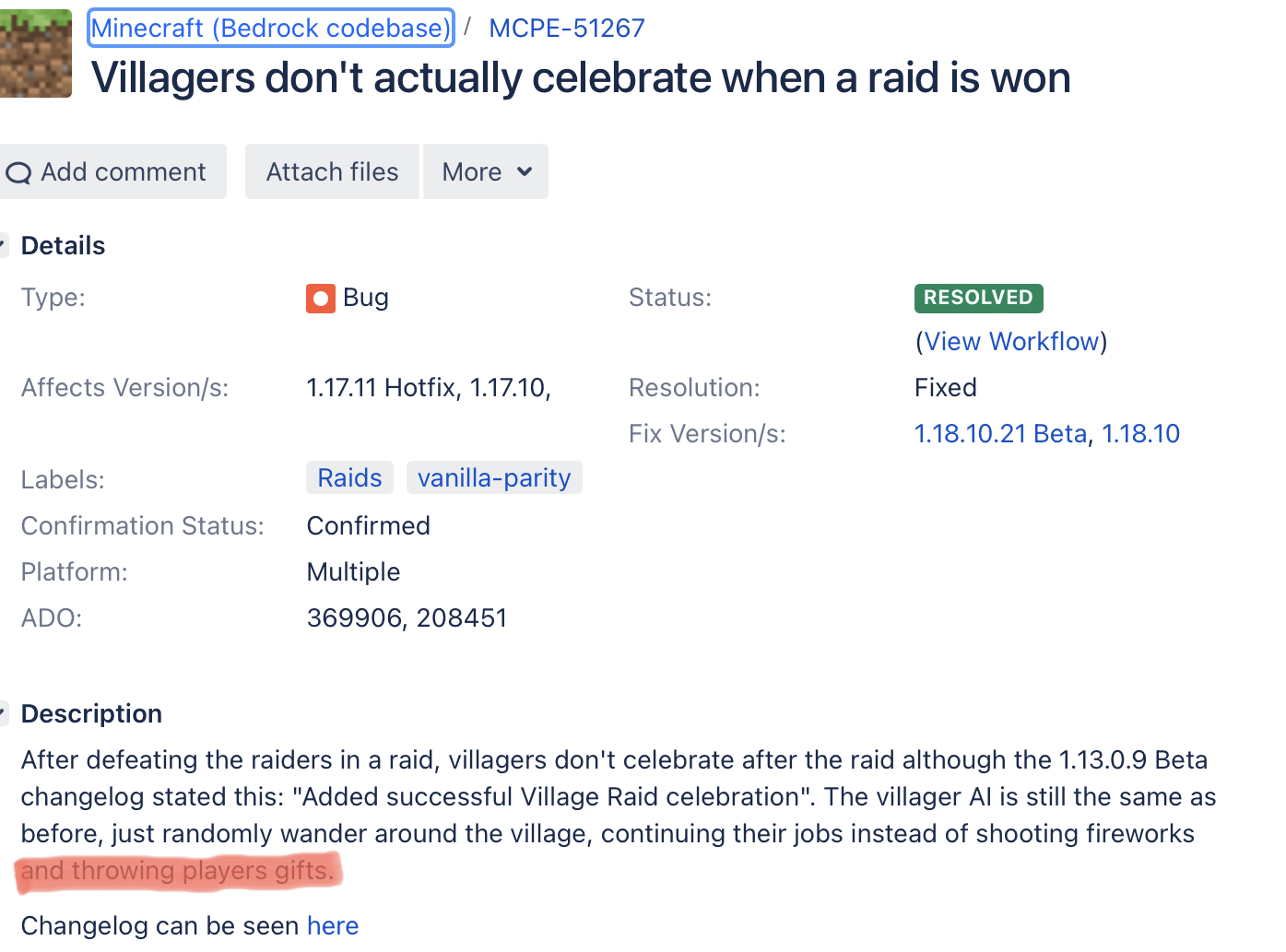 Even tho it says this parity fix is resolved, the only thing new that the villagers do now is to shoot fireworks when a raid has been defeted.