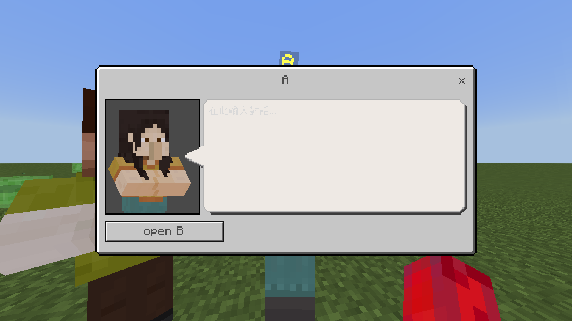 3. creat a button(open B) command(/dialogue open @e[type=npc,tag=B] @initiator)