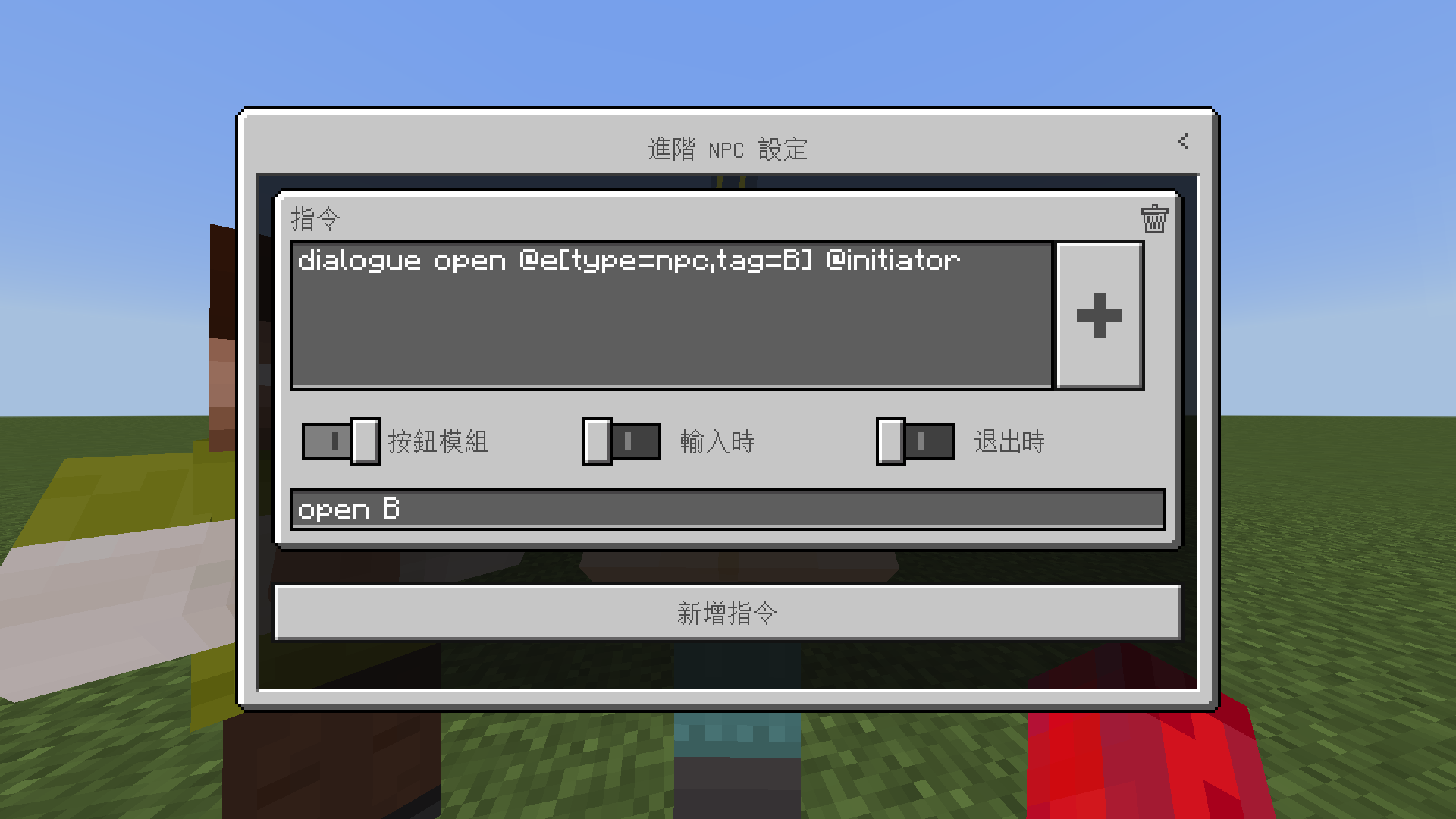 3. creat a button(open B) command(/dialogue open @e[type=npc,tag=B] @initiator)