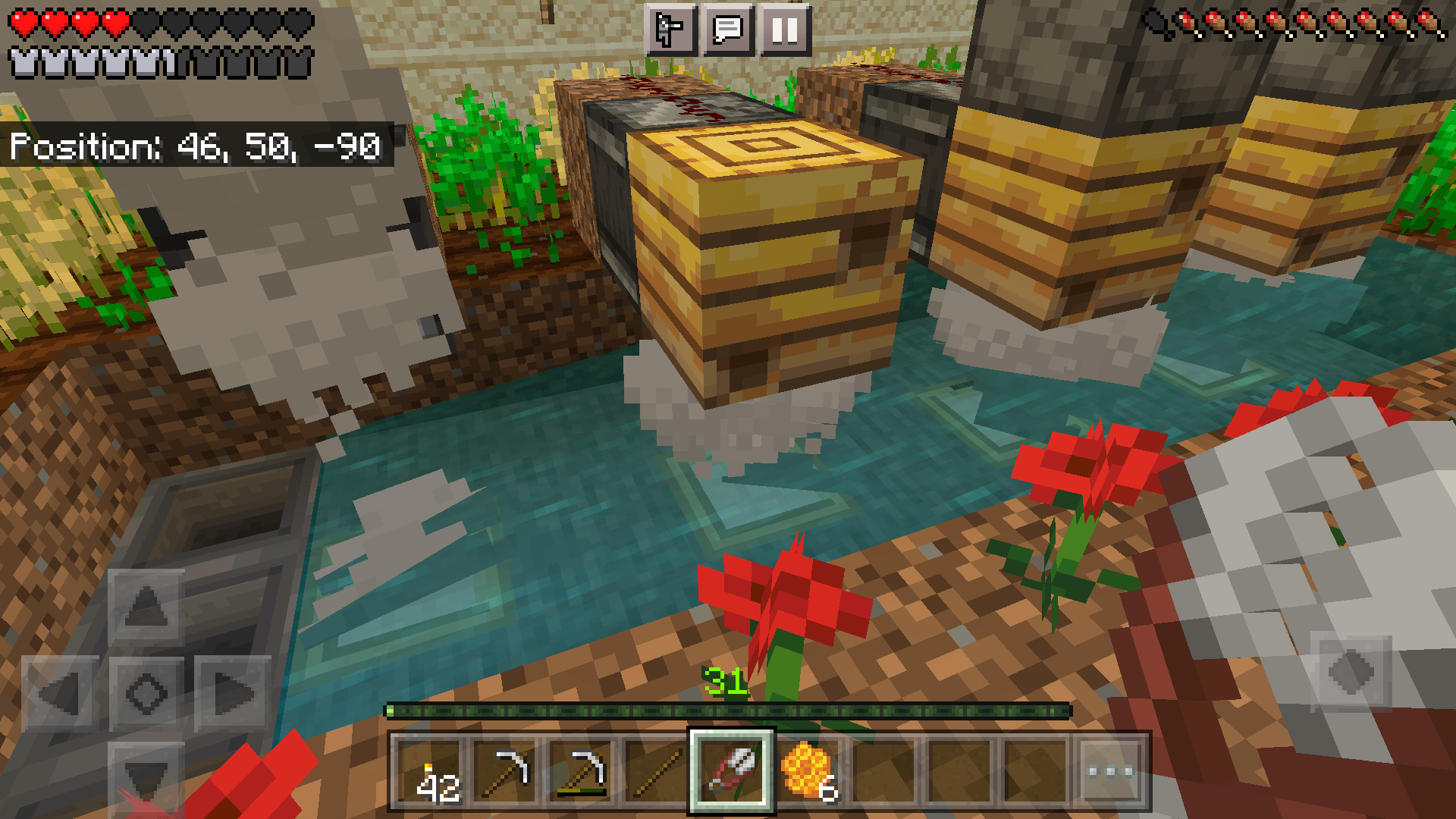 I am in a bedrock world with experimental wild update features enabled. I've been tooling around in peaceful getting my base set up and noted an odd behavior in my bees. I have my hives set up over flowing water for easy collection. Under each nest and under the water, I have a trapdoor covering a campfire. The smoke clearly rises and pools under the nests. I noted that when I sneered a nest to get honeycomb, even at night the bees would immediately emerge, buzz around then return home. So I made a copy of the world and switched to hard mode, and when in to manually sheer a nest. The bees emerged and attacked. Bees should not attack when sneered for honeycomb in the first place, and definitely not with smoke beneath their nest to calm them. Attached is a photo of the setup, the nest not yet hooked up to a dispenser where bees attacked upon being manually cheered for honeycomb