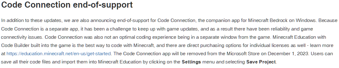 Code Connection has been out of order for more than half a year now! Can you please do anything more than closing new tickets as duplicates of this one? I paid for Minecraft so that my kid can learn some programming with it.