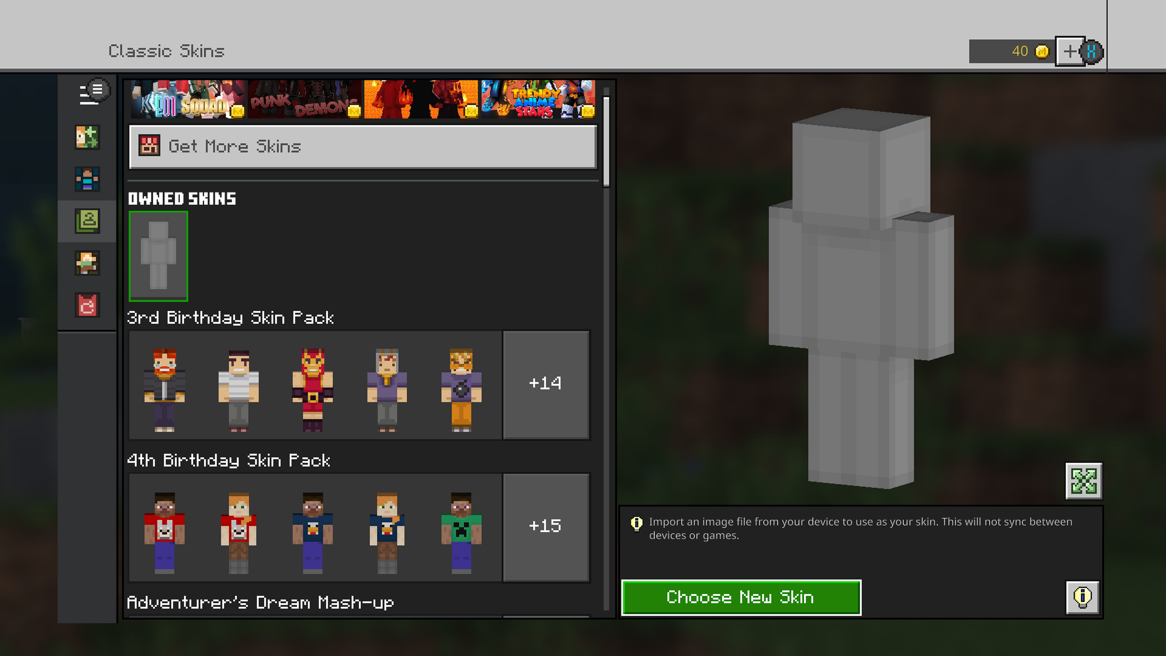 I noticed that the Dressing Room has a button to add a custom classic skin. Clicking on it lets me browse to pick a .PNG, much like on PC. But once you click on the image file, nothing happens. This has been tried both with skins on flash drives as well as skins transferred to the Xbox’s Pictures folder.