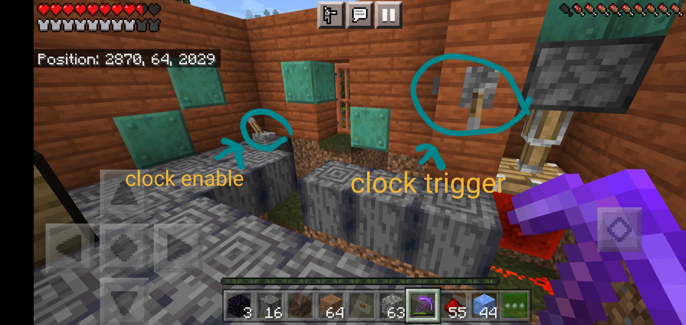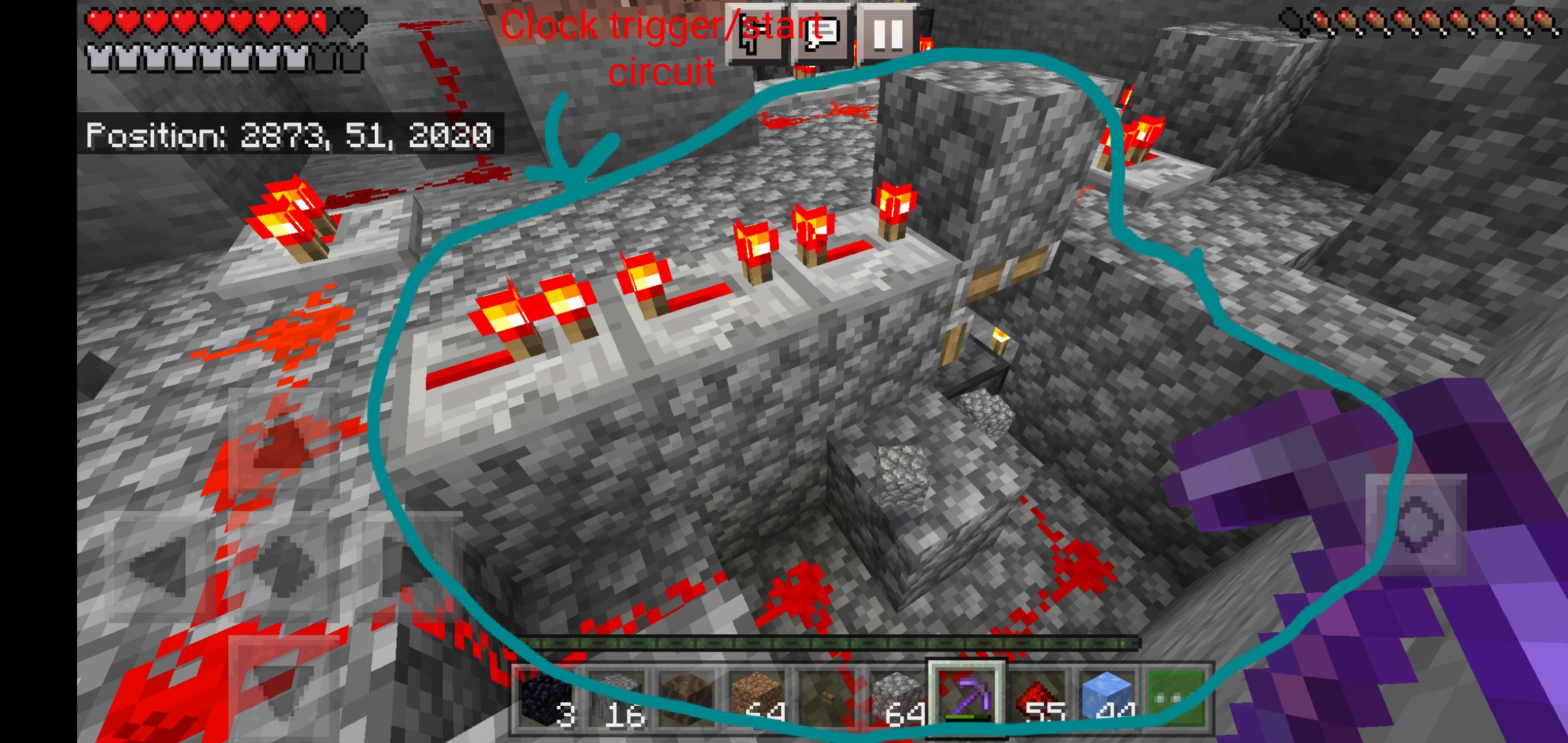 Redstone clock and pistons. If I am at y= 51 and push a button connected to the clock