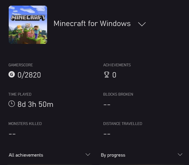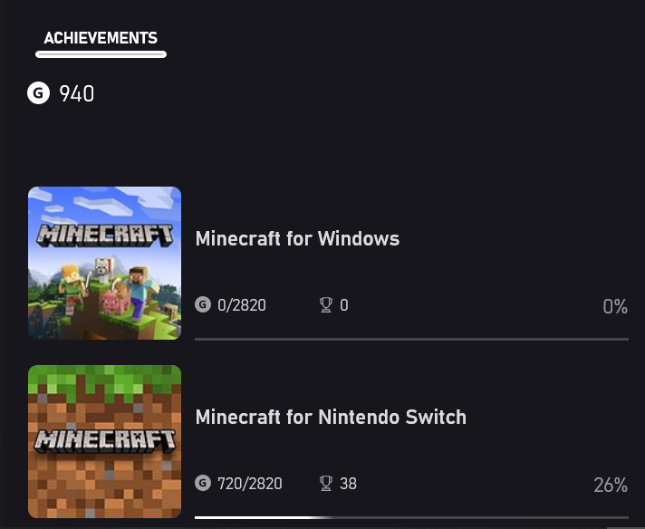 I started playing Minecraft on Nintendo Switch in Survival (no cheats) and a few months later I purchased Java and then Bedrock versions for Windows 10. When I registered for Xbox game pass, my profile reflects Nintendo Switch and all 38 achievements and other statistics including hours played but nothing for the Windows 10 Bedrock edition other than the amount of time played. Even when I re-attempt the achievements in the Windows 10 edition, it does not reflect nor register and is greyed out on the Xbox Profile (see attached screenshots). I have uninstalled Minecraft on both Switch and PC and re-installed, checked for corrupt files and nothing. Still the same status quo.