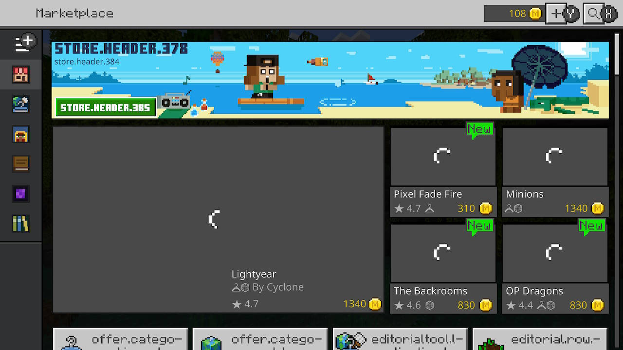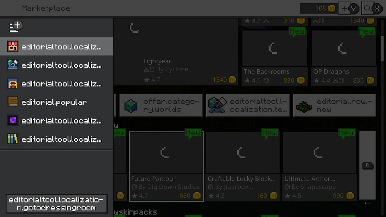 For the past year at least there has been issues with the way menu titles load on the switch. Instead of showing the title, it shows some variable name like "store.header.378" or "offer.category.skinpacks" for example (see pictures). I don't know if this only affects me or other switch users, but i've tried uninstalling and reinstalling my game many times over the past year and it doesn't help. Not to mention that icons in the marketplace or character creator never load, but I think that is more of an issue with optimization. This makes the marketplace impossible to look through, and the character creator extremely tedious, having to select and look at every single option since you cant see their icons.