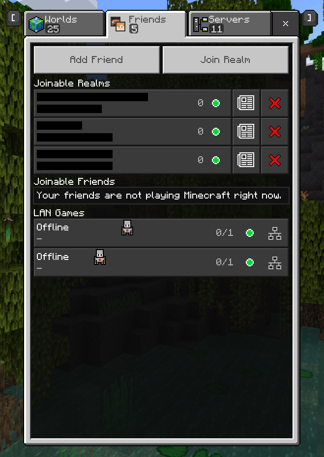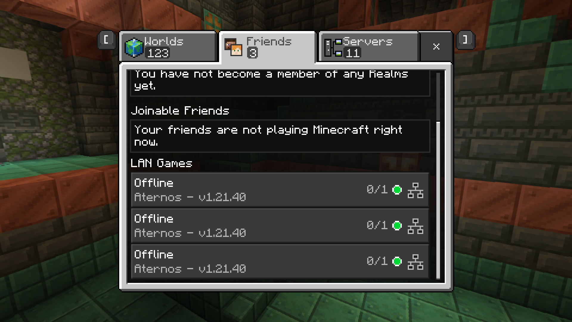 On the friends tab after pressing play, there are random LAN games. When I try to join them, they just say they cannot connect. Their names are blank and they say offline. On my phone, it happens even on cellular data. It's probably just something going on with my account but I thought i'd report it and see if it can be reproduced and fixed.