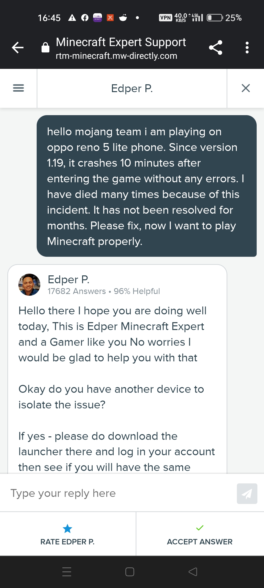 This is my second complaint you didn't solve in the first. I wrote to the minecraft support team and said, write a bug report again. please get it resolved. my phone is oppo reno 5 lite and after half an hour sometimes 10 minutes after entering the game, the game crashes (kicks the game) without any error. I looked at the comments of minecraft on google play store everyone in this model is complaining about it. it is not normal for everyone in this model to complain about minecraft crashing.please look my report.