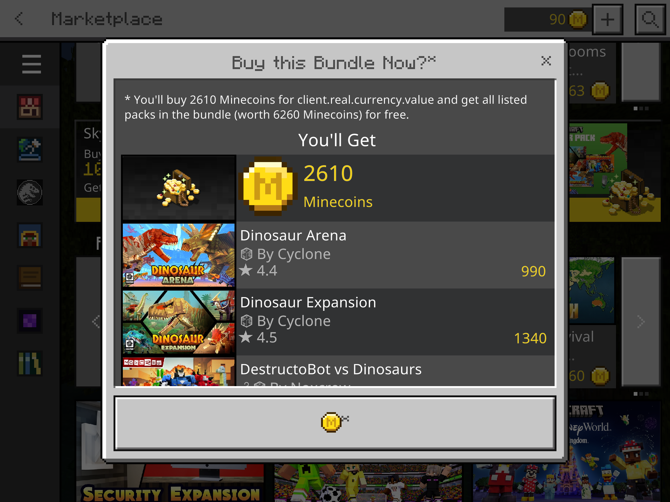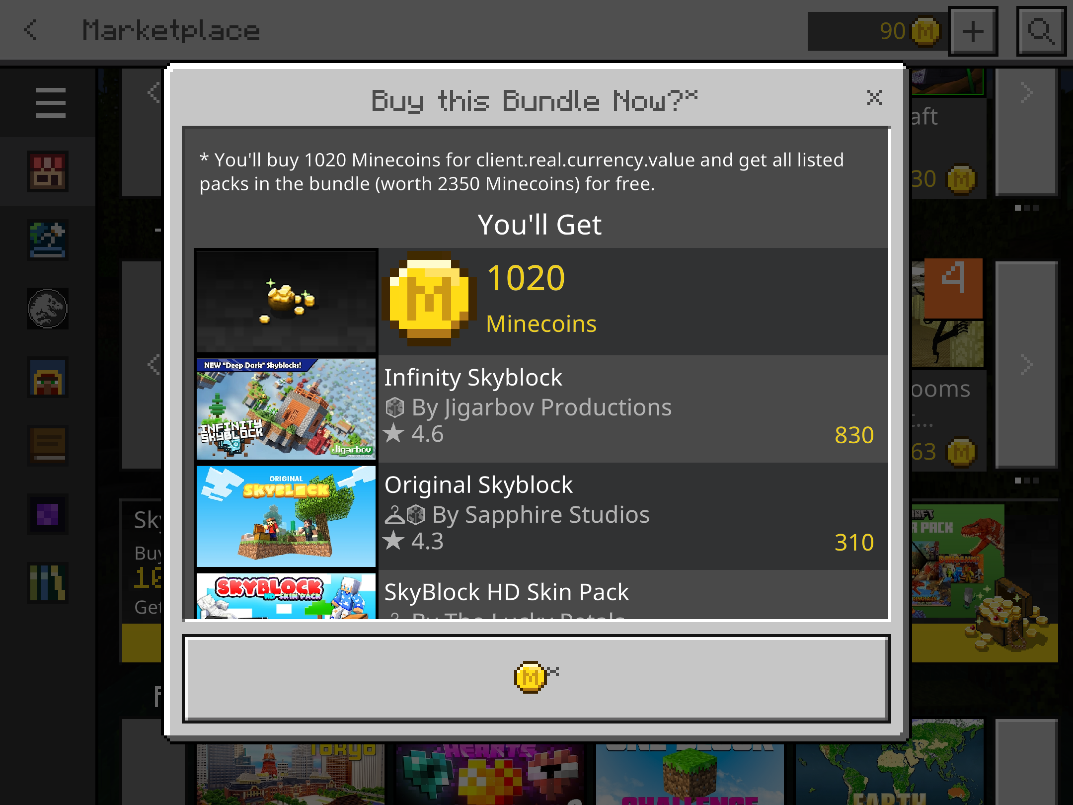 The Skyblock and Dinosaur Pack in the Marketplace and clicking on the Pack doesn't show the price of it, instead it shows 1 Minecoins and a weird symbol (which I don't know). It affects iOS. I will have a check later and update you guys. It also says client.real.currency.value for some reason as shown in screenshot.