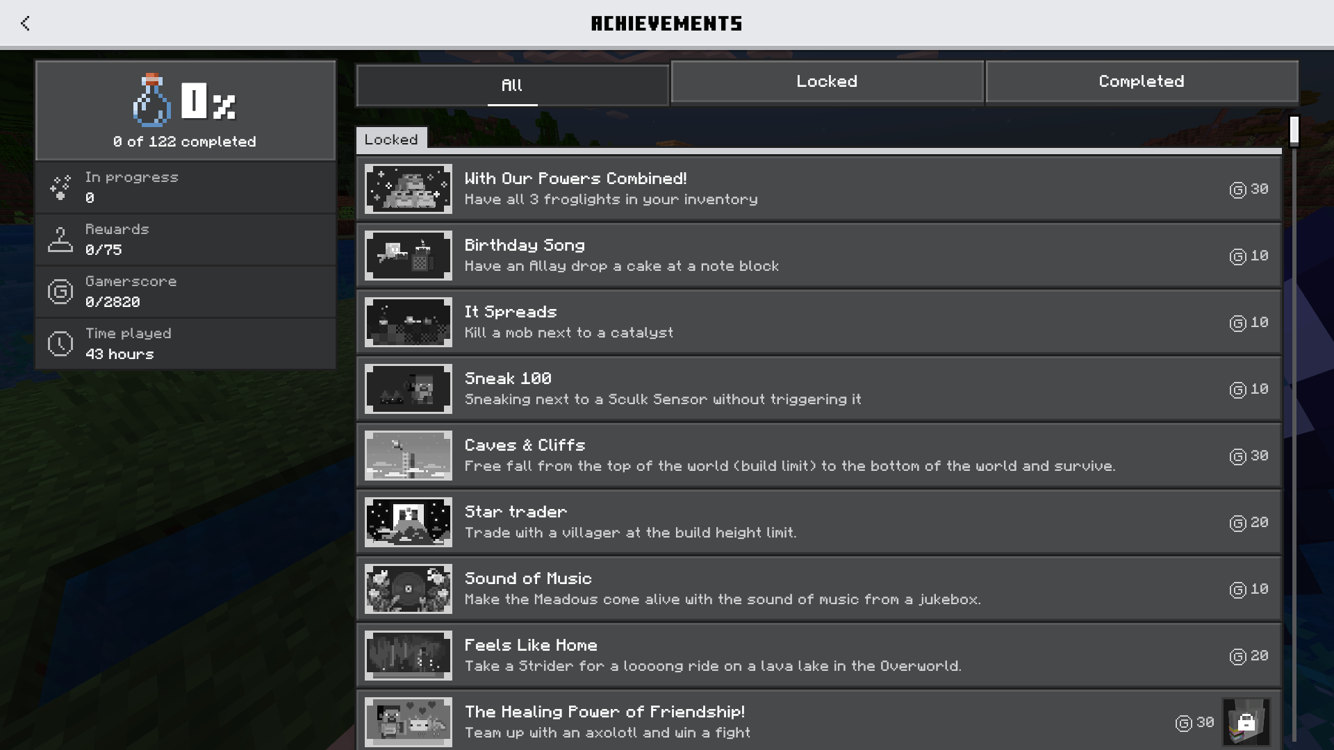 Hi, So I bought Minecraft recently and start playing bedrock and I notice that I can't get any achievement like I tried everything but doesnt work and I dont have cheats on or anything like that, I create another worlds and nothing, and now I have 43 hours without any achievement.