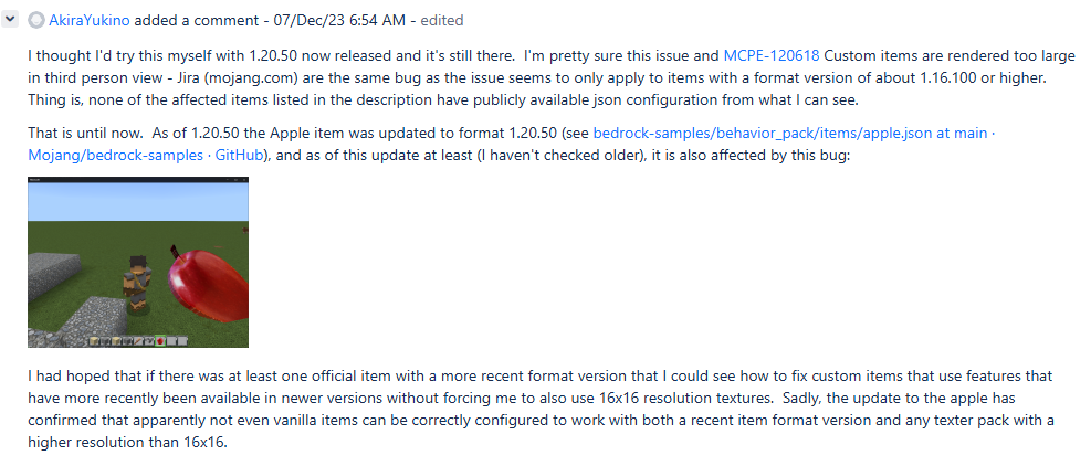 I have reported the bug in MCPE-169734, However the page became invaild because it was identified as a bug of the texture pack issue, but actually the bug is a general bug of game. I just gave an example by using an HD pack from Marketplace. ALL of HD texture packs when you use then the bug will happen and only happen in Preview 1.20.0.21. In addition, the higher resolution of pack for using, the bigger items in your hands will be.