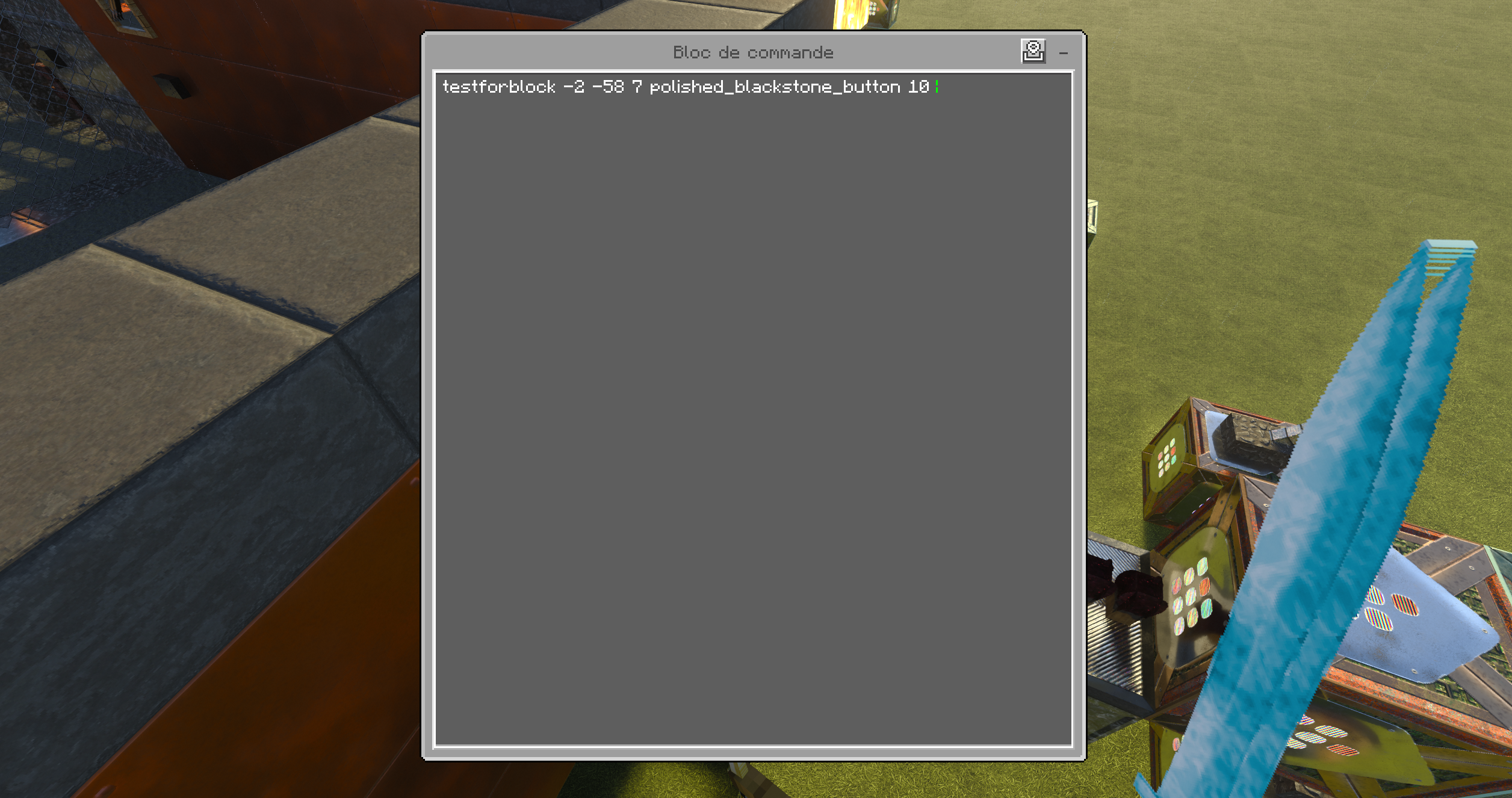 I have a little problem with the command "/setblock" which is quite disturbing for me because I have fun creating maps of all kinds and so I use the block command a lot. (I put the pictures in chronological order of things) To start on the first image I perform the basic command to make a button appear, on the second image you can see the result. The button appeared but strangely not at its origin that is to say that the button should have appeared on the block below but on that face of the top. On the third photo I add an orientation so that it appears on another side and in the next photo we can see that there is an error which is not normal. So I went to another map that I had made and finish in which I had made use of this command. On the fifth picture I show you the same command but slightly different that is to say that it will test the state of the button which is on the axis "z" and the command will detect if the button is in the active or inactive state. Hence the 10 at the end. and on the last photo we can see that the result does not show error as on the other map. I had also tried on a blank map I had just created to see if it came from my maps, but no. I have not found anything on this problem at the moment.