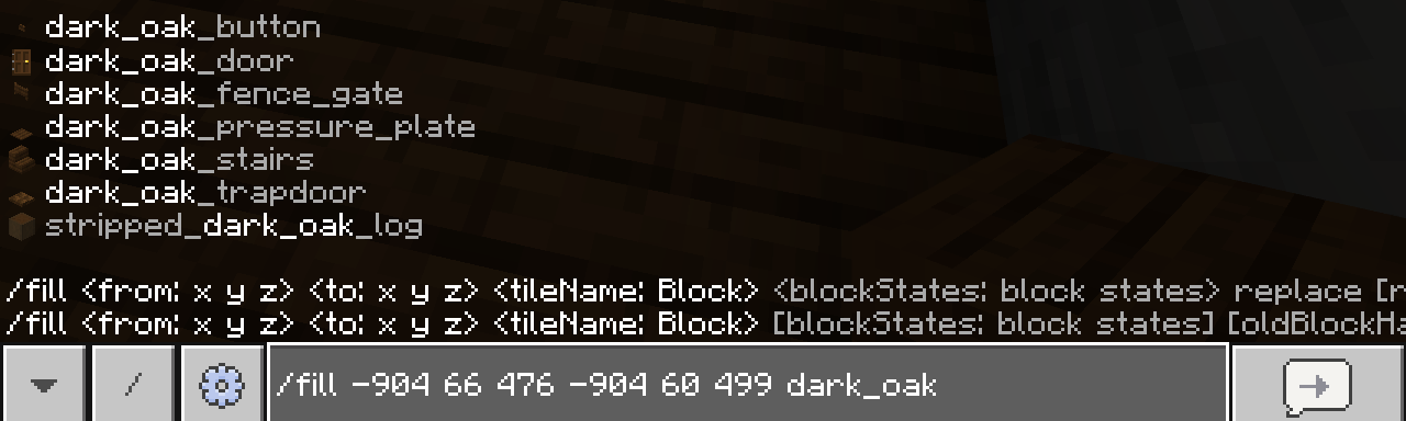 I've been trying to use /fill to fill a large area in my minecraft world, but the command says that dark oak doesn't exist, this only applies to plank and slab variants of blocks. I really have no idea what's going on