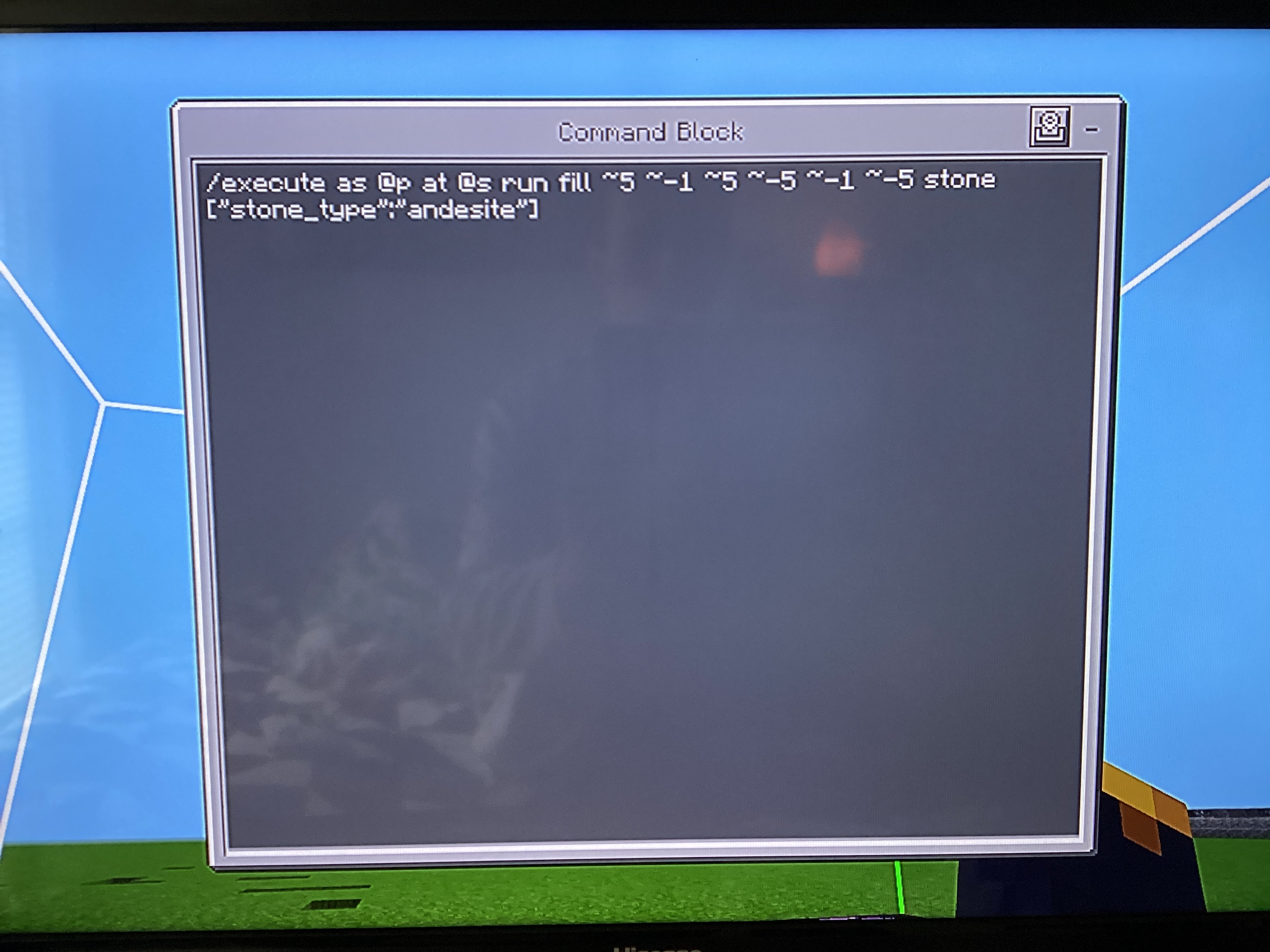 /execute as @p at @s run fill ~1 ~-1 ~1 ~-1 ~-1 ~-1 stone ["stone_type" : "andesite"]