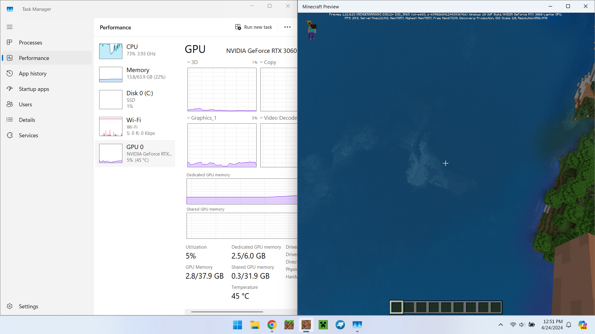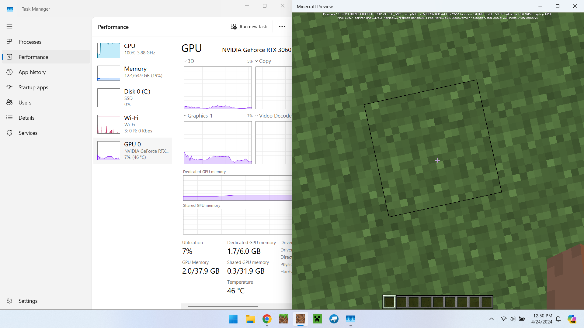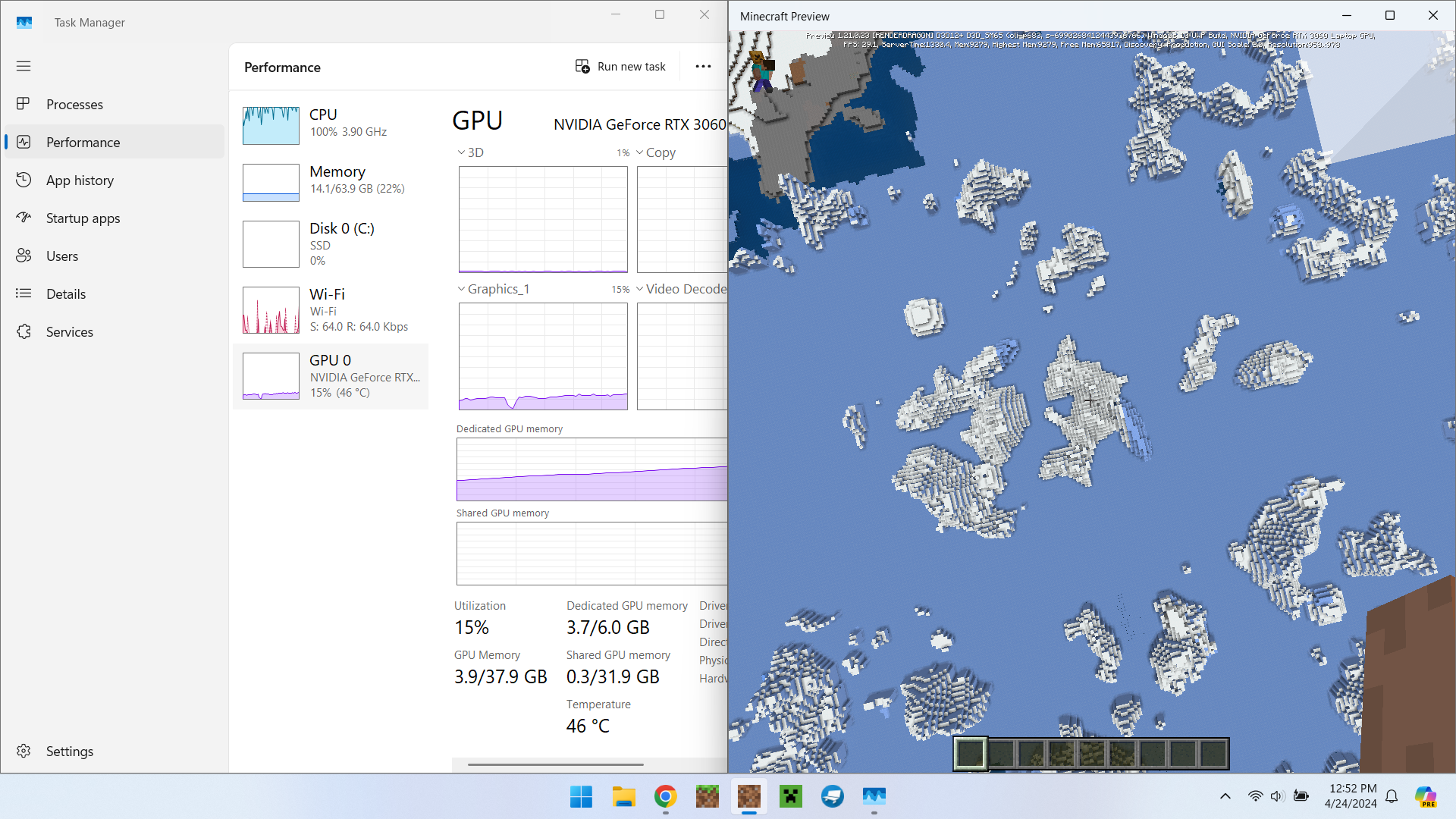 Update #1: The performance got even worse in the 1.20.30.20 preview, and mind you, this is coming from a Mid-High end computer (RTX 3060 + AMD Ryzen 7 5800H). I get higher fps in Minecraft Java! Also, I don't know if this is part of the issue or not but, take a look at some screenshots I have provided, Minecraft Bedrock is using 100% (at high render distance, it's a leakage test) of my CPU while only around 0-4% of my GPU! That's at least one reason why Minecraft Bedrock is so laggy! It barely uses the GPU!