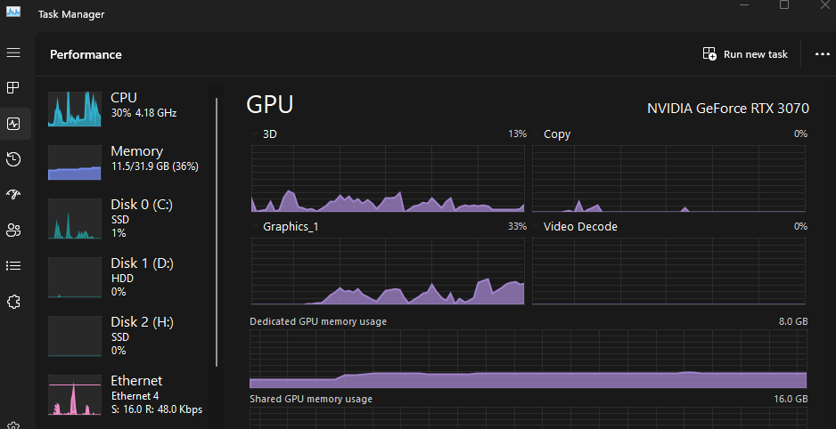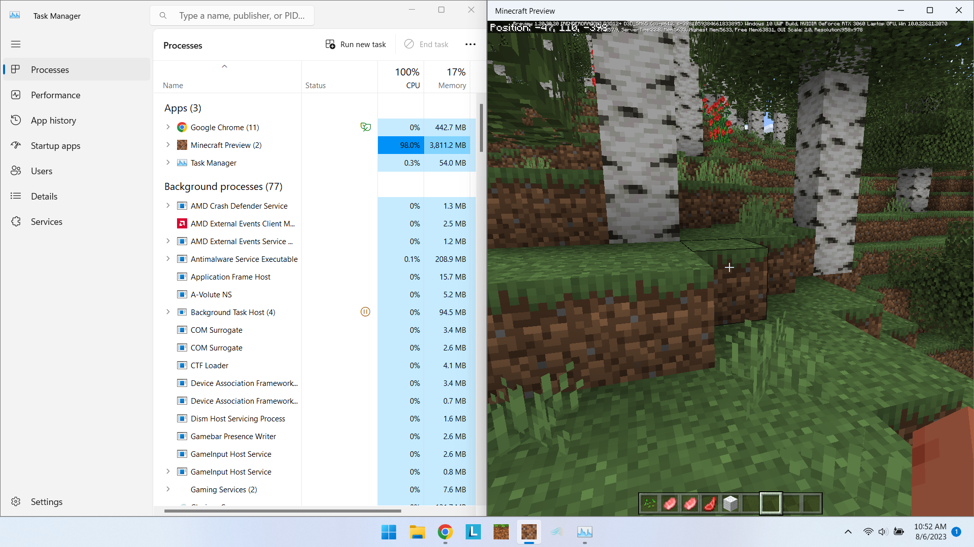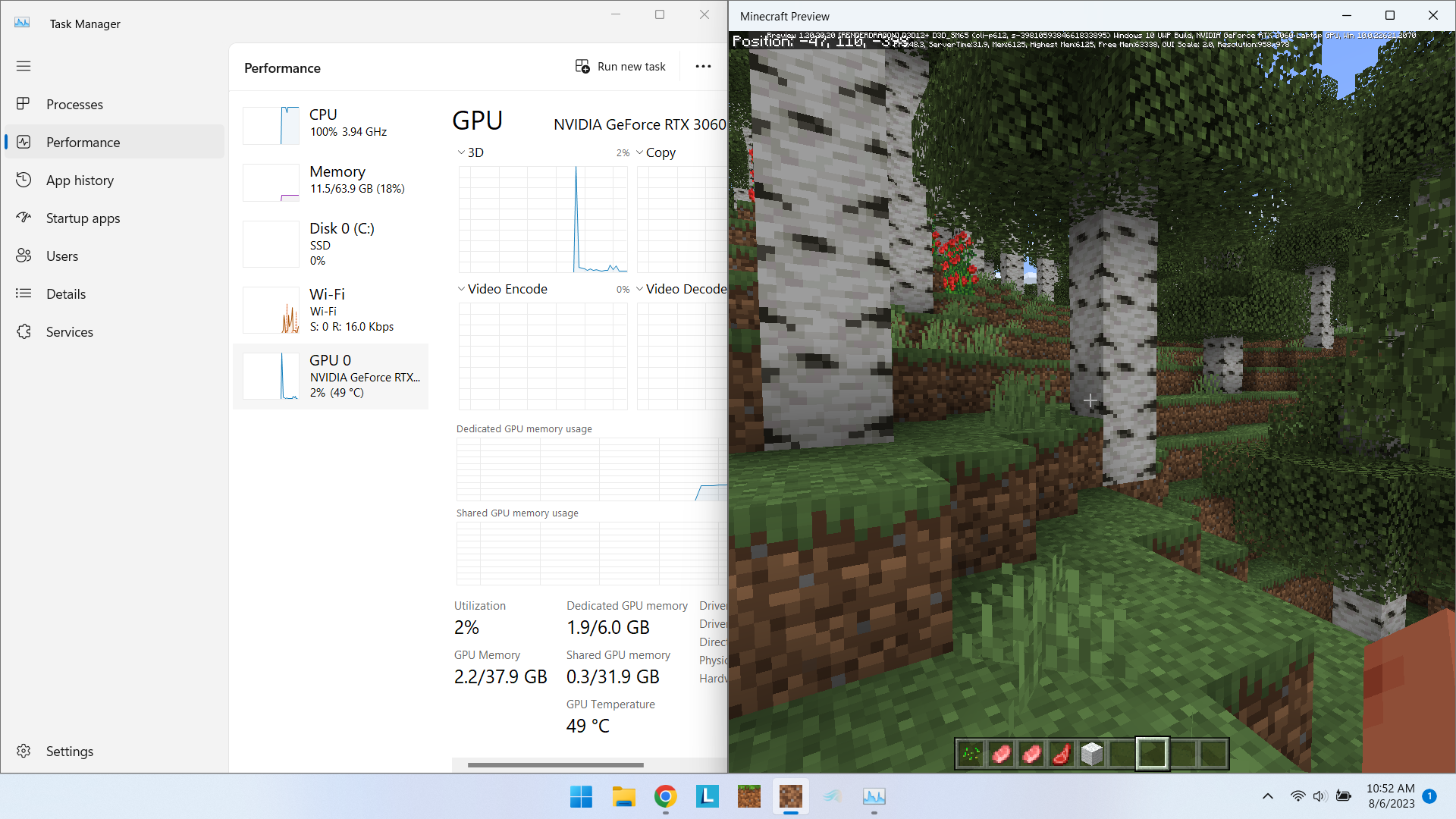 Update #1: The performance got even worse in the 1.20.30.20 preview, and mind you, this is coming from a Mid-High end computer (RTX 3060 + AMD Ryzen 7 5800H). I get higher fps in Minecraft Java! Also, I don't know if this is part of the issue or not but, take a look at some screenshots I have provided, Minecraft Bedrock is using 100% (at high render distance, it's a leakage test) of my CPU while only around 0-4% of my GPU! That's at least one reason why Minecraft Bedrock is so laggy! It barely uses the GPU!
