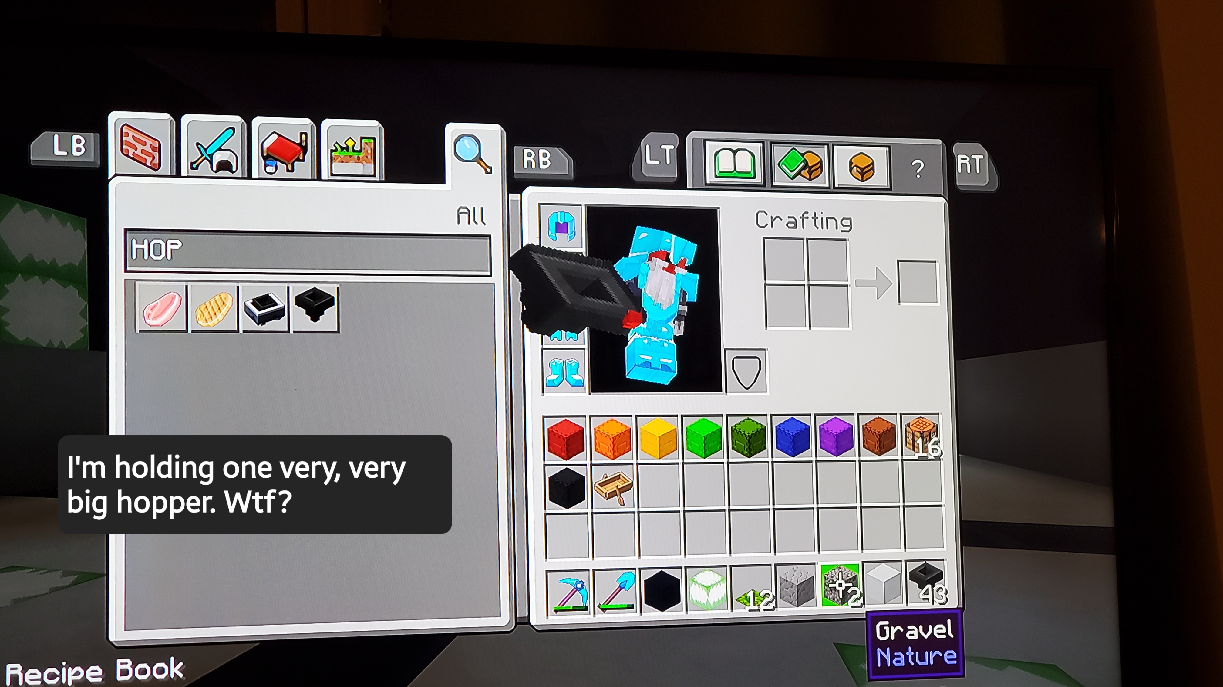Xbox One X. I have no idea how to reproduce this issue. I was building a hopper line, pulled up my inventory to switch to another block, and saw this huge hopper in my hand. Hoppers are placing and functioning normally. No other block becomes ginormous when held. No mods. I'm using a texture from the Minecraft store. It's VanillaBDcraft and its accompanying HD UI. Until this latest update, I've been using the texture a long time with no issues. This glitch seems purely cosmetic to me. I've been playing Minecraft for a thousand years, so all this did was give me a good chuckle on an otherwise very bad day. Thank you for that. I needed it bad. In truth, I appreciate your hard work. Playing Minecraft helps me keep going all the time. ❤️❤️❤️