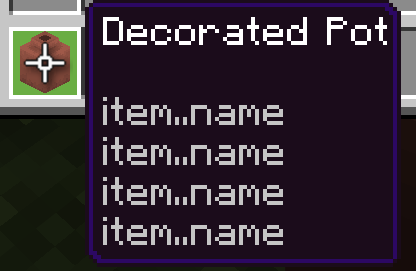 In the 1.20.10 previews, decorated pots were given descriptors for each face when hovered over in the inventory. However, if you place a decorated pot from the creative inventory and pick block it, all of the faces are listed as "item..name".