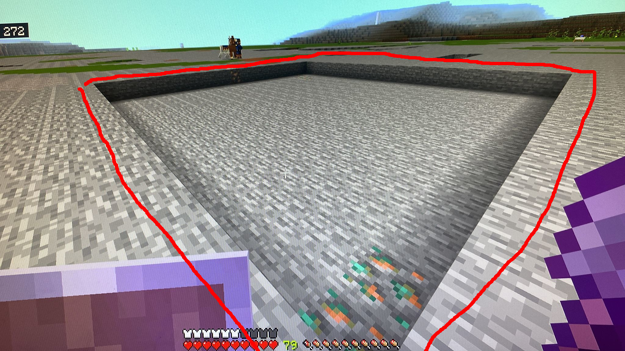 also, in the bottom image, you can see this sudden "hole" on a flat surface, which I've circled in red. This particular hole measures 16 by 16 blocks, indicating that it appeared within a single chunk. This has happened to me twice now on my Survival Realm. The issue seems to arise when I flatten large areas. Additionally, before I noticed this hole, I had difficulties joining my Realm. It took an eternity to load, and the connection was eventually dropped. After about 30 minutes of trying, I finally managed to join. That's when I discovered this hole within a chunk.