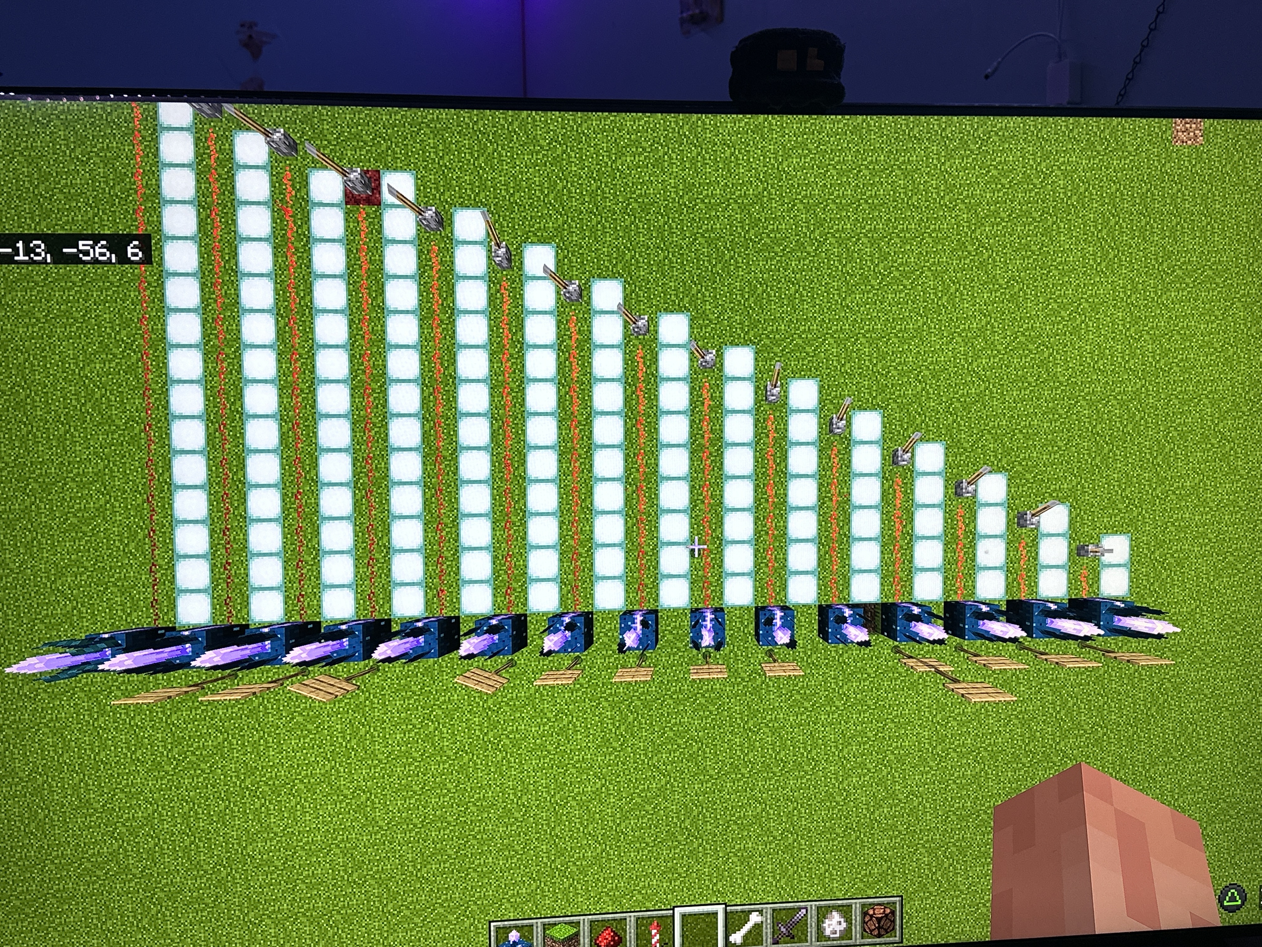 the photo below is of me in my creative world flying around my testing site with sea lanterns placed down to better count the blocks that have redstone dust to help identify the signal strengths given to the sensors