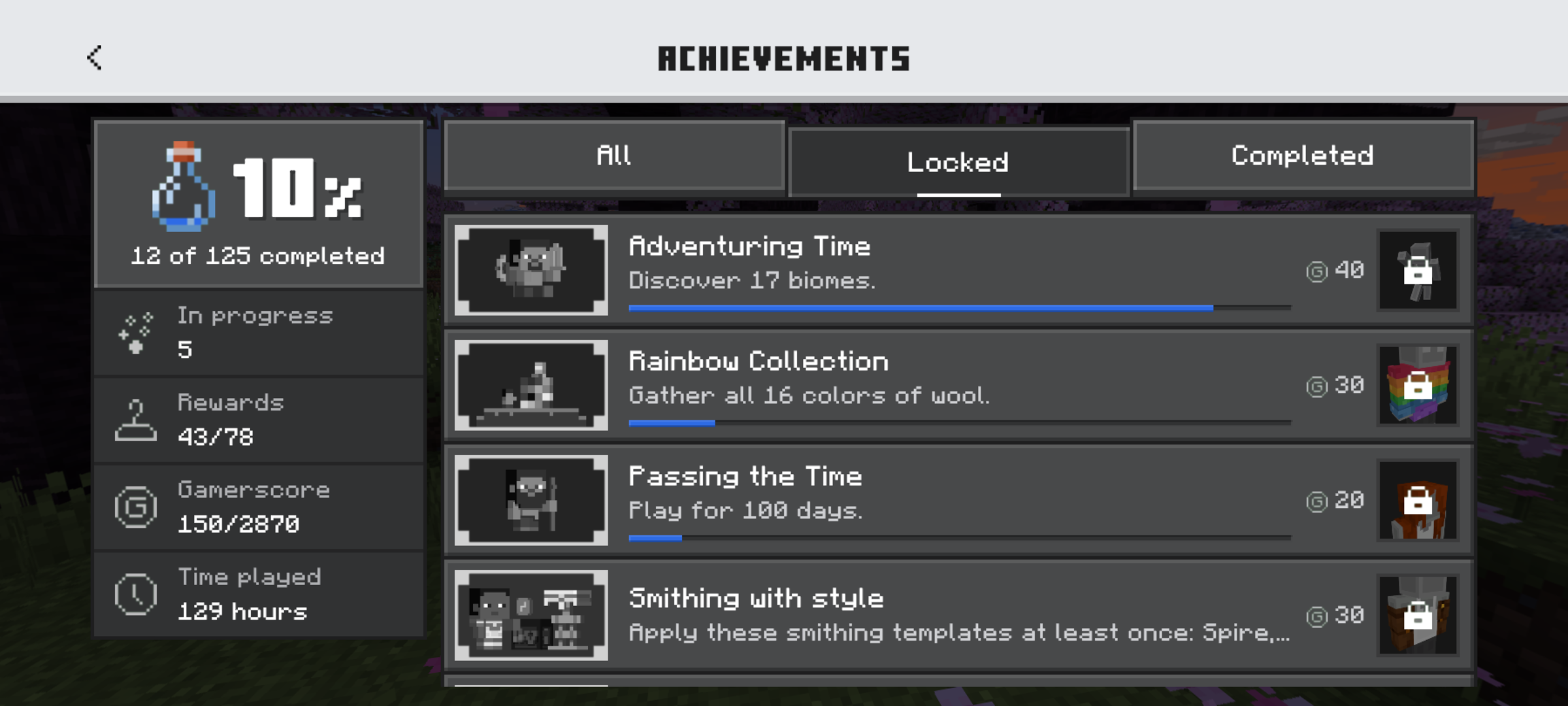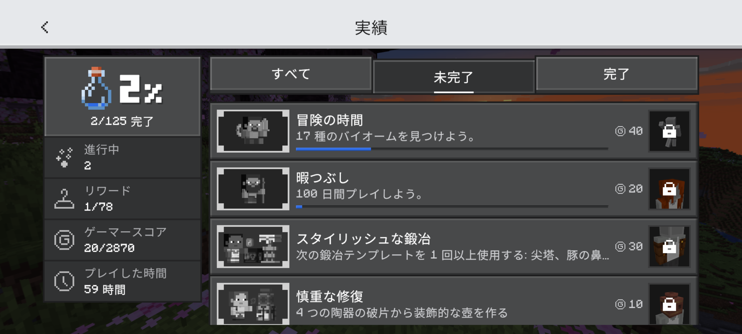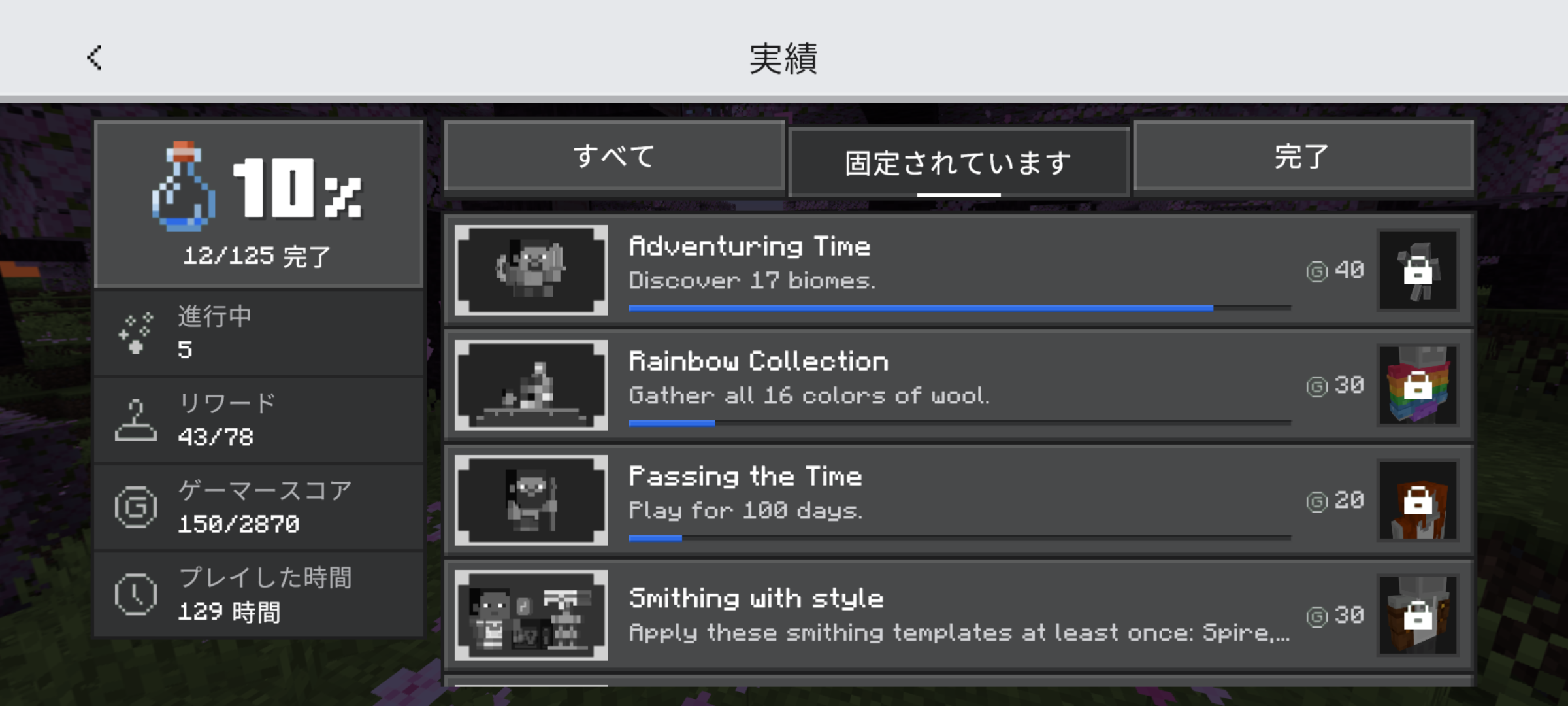 The "locked" tab on the achievement is translated into Japanese as "固定されています" but it doesn't make sense. It would be best to translate this as "未完了'', following japanese translation of "completed'', which is "完了''.