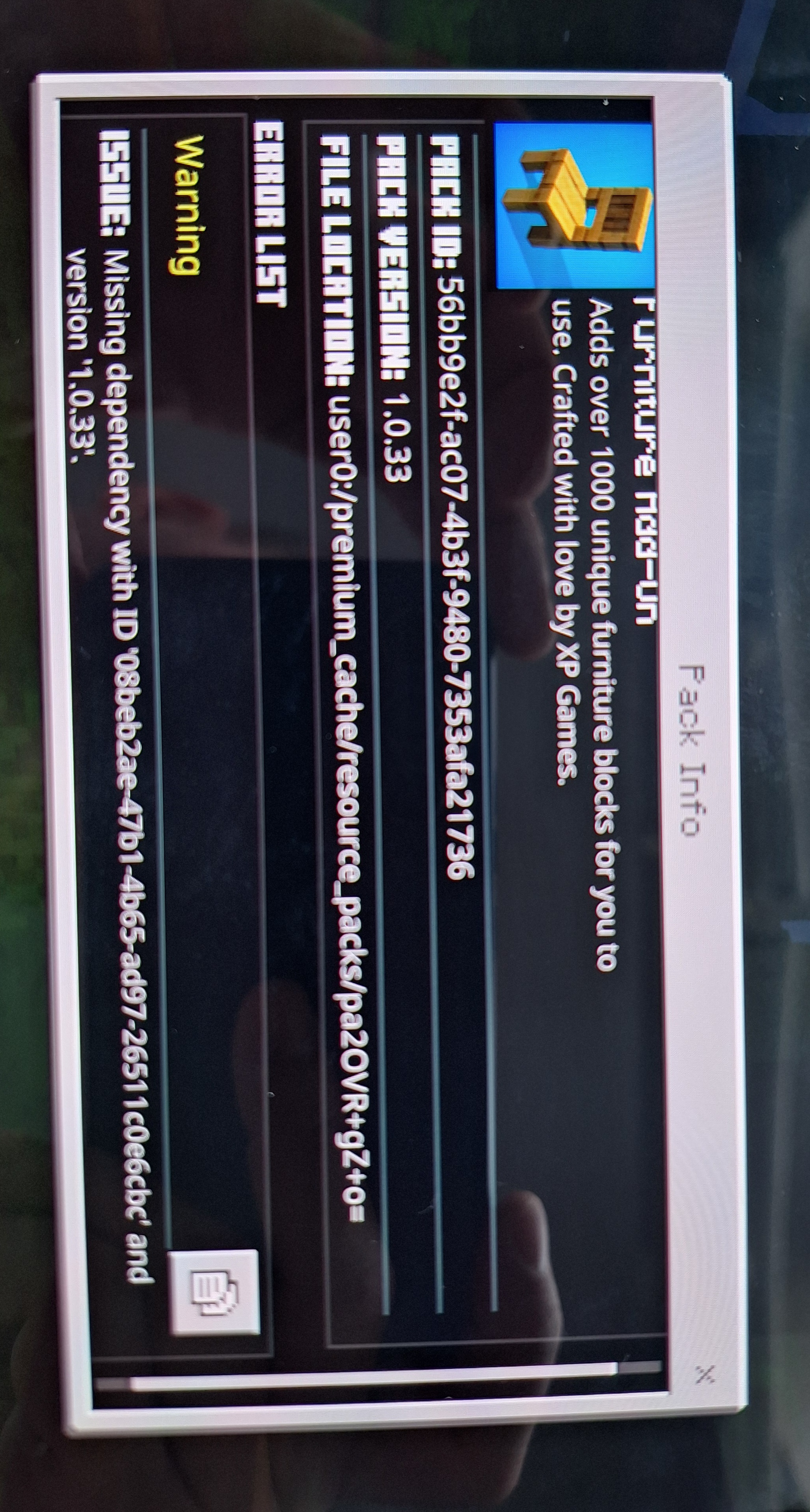 as well as the packs showing active in settings but no longer functioning/displaying elements in worlds (creative menu & where previously placed/spawned)