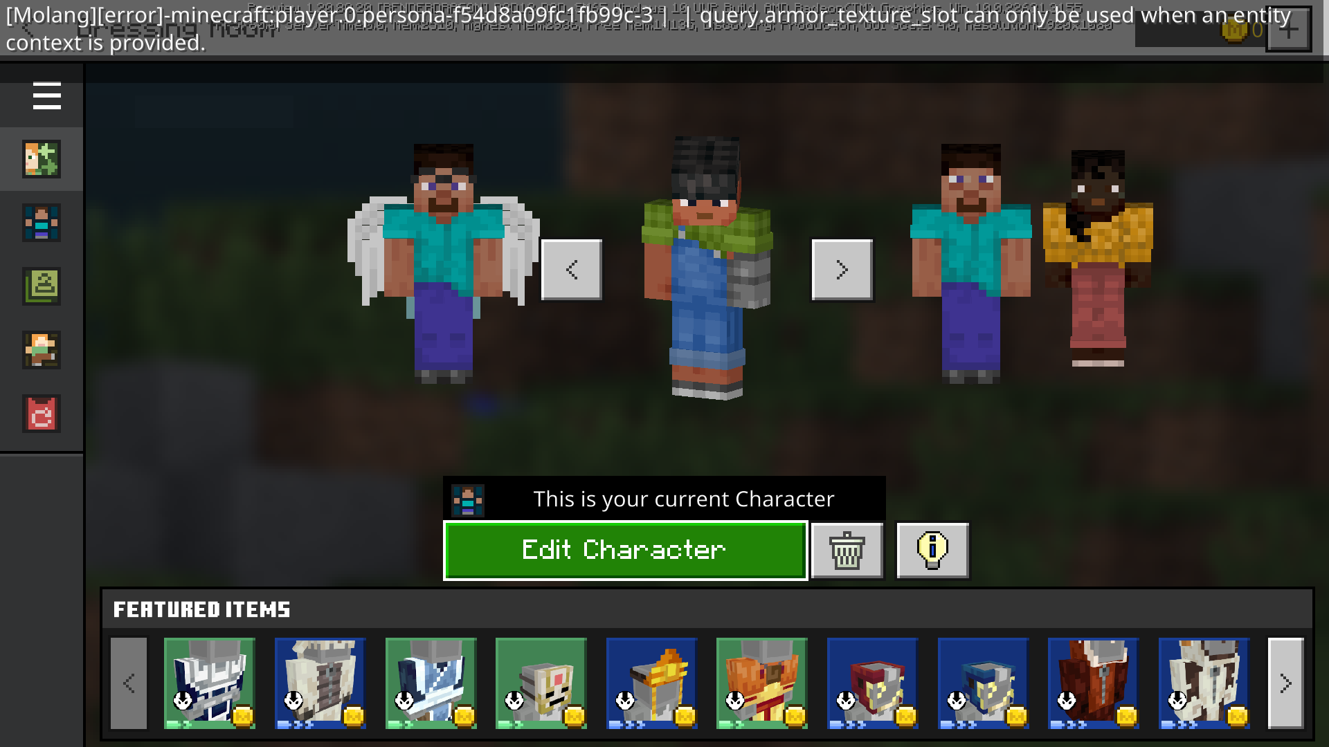 [Molang][error]-minecraft:player.0.persona-19747a2db20c4ed7-0 | | query.armor_texture_slot can only be used when an entity context is provided.[Molang][error]-minecraft:player.0.persona-19747a2db20c4ed7-0 | | query.armor_texture_slot can only be used when an entity context is provided.This is fully reproducible in vanilla minecraft without any RP/BP enabled.