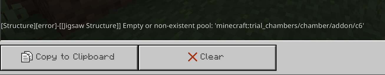Due to the recent changes in the trial chambers structure, when creating a new world and loading it up, this content log error appears:[Structure][error]-[[Jigsaw Structure]] Empty or non-existent pool: 'minecraft:trial_chambers/chamber/addon/c6'
