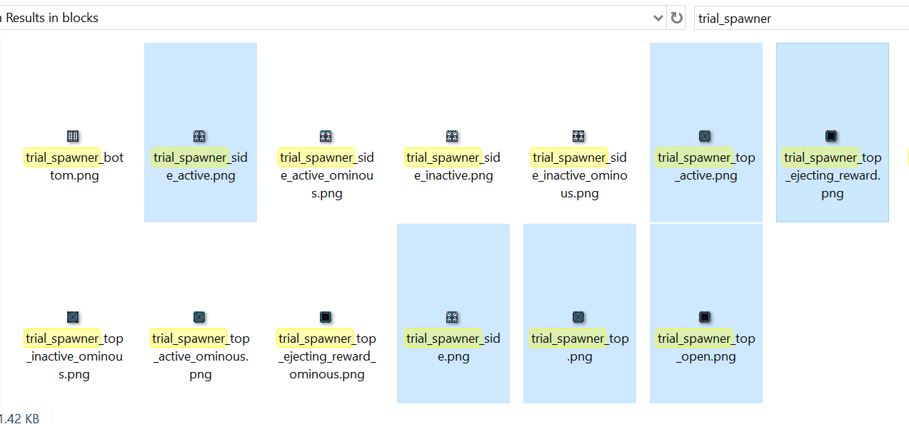 In the textures/blocks folder in the 1.21.0 resources, there are duplicate files for three Trial Spawner textures. The duplicates are unused and should be removed. The Ominous Trial Spawner is not affected by this issue.