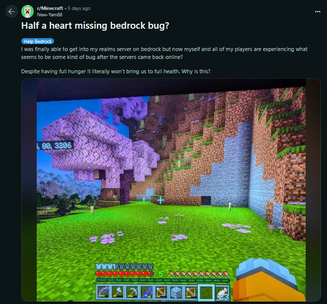 I'm recently playing in a solo survival world and noticed that my health is not full though I'm not hungry and not taking damage from anything. I was wearing a diamond armor with enchantments and a gold helmet with enchantment as well because I recently visit the nether to get some blaze rods. I've been noticing it since yesterday and I tried to go to reddit and see if I am the only one who's having the problem and found out that I am not the only person who's having this issue. Even when my hunger goes down and try to eat, It won't replenish that half heart.