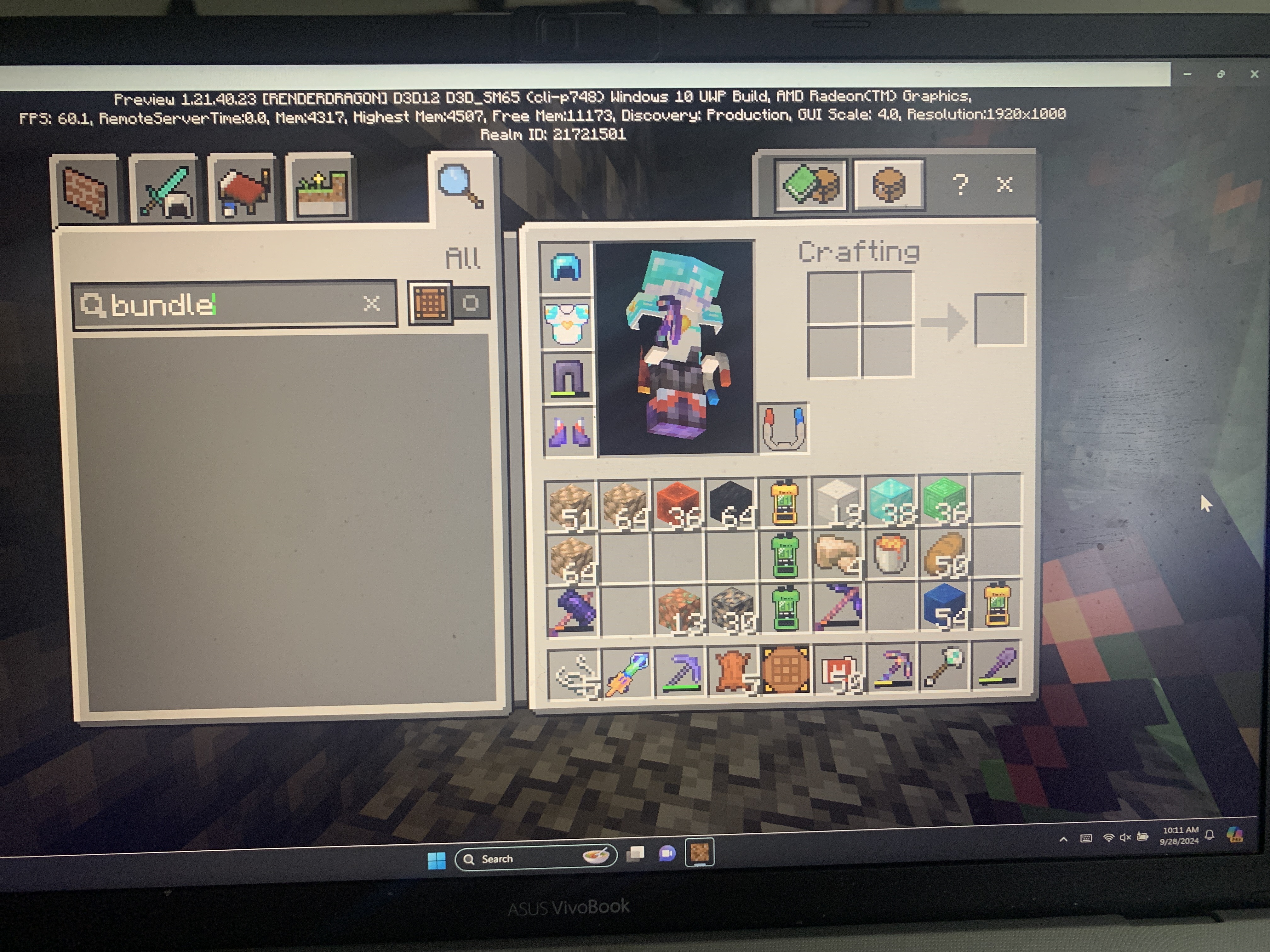 Immediately following the release of 1.21.40.23 bundles and all of its color variants disappeared completely. I could no longer craft them with string and leather, and wasn’t able to put one in my inventory with the /give command either. The bundles that had previously existed in my inventory (both filled and unfilled of different colors) completely disappeared as well.
