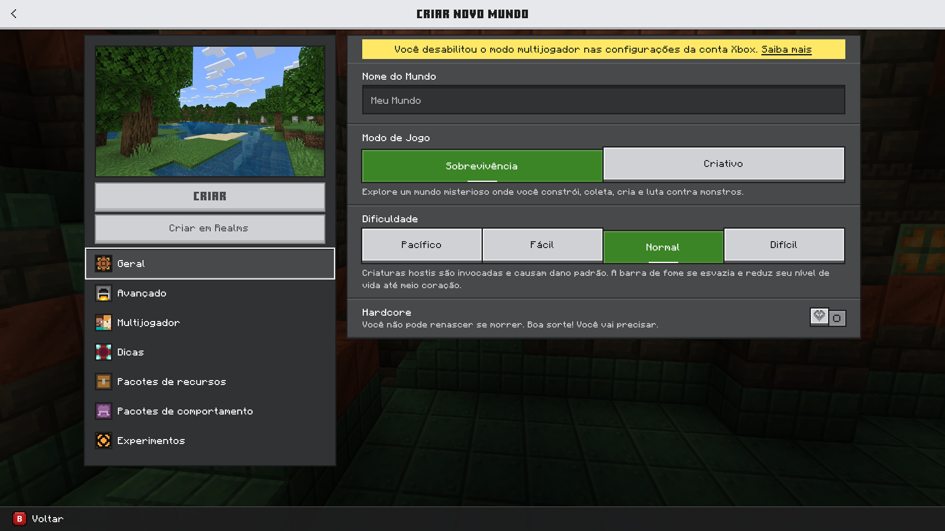 When I try to create my world on Xbox Bedrock through my Xbox, the button that says CREATE, instead of being green, is white and I can't click on it, I've already uninstalled Minecraft and installed it again, already (I'm Brazilian, so the photo I posted has the words in Portuguese)