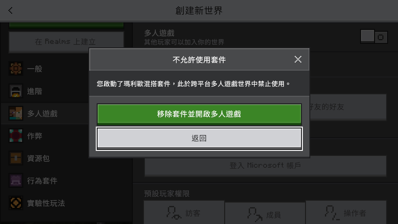 Actual result: It causes the pop-up to appear, telling players to deactivate the resource pack (see "resource-pack-disallows-multiplayer.jpg", translated to “Content disallowed”; “You activated the Super Mario Mash-up Pack, [which] this is not allowed on cross-platform multiplayer.”, “Remove content and re-enable multiplayer”; “Back”), and it makes hosting the world only in Switch-specific multiplayer over Nintendo Switch Online impossible.