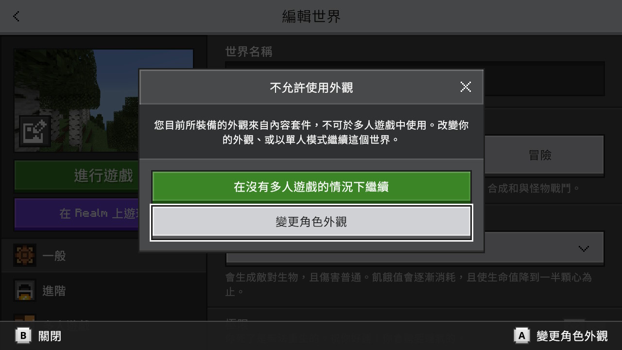 Actual result: On step 8, Both cross-platform multiplayer and Switch-specific multiplayer over Nintendo Switch Online and Multiplayer toggle seem to be locked disabled, inconsistent to one from Minecraft Help. On step 9, an offending pop-up claimed that the skin isn't usable on (all forms of) multiplayer (see note) appears, contradicting one from Minecraft Help. However, as long as you didn't activate the resource pack of the Super Mario Mash-up Pack, this has no effect when entering the world as it basically only allows Switch-specific multiplayer over Nintendo Switch Online anyways.
